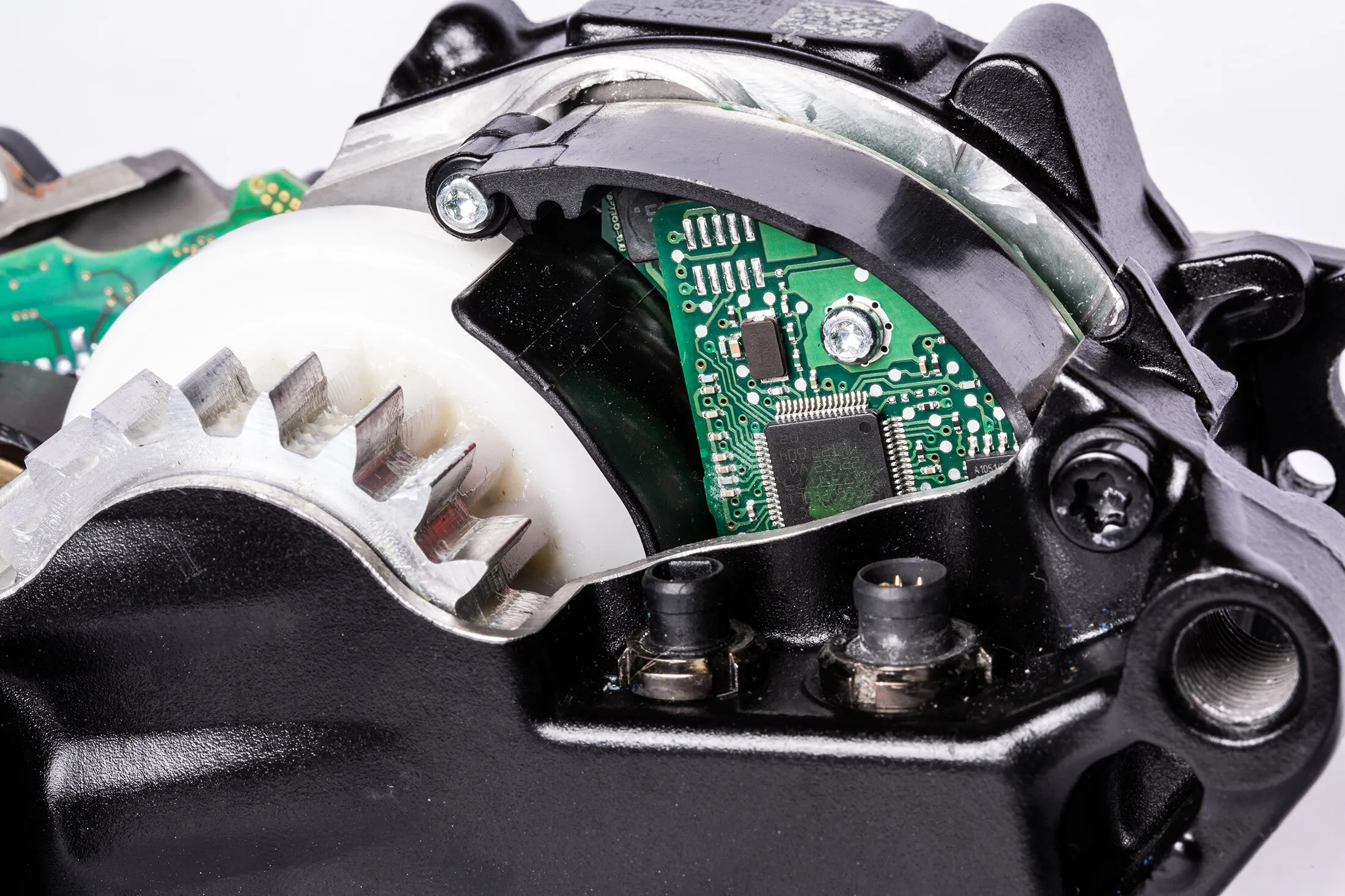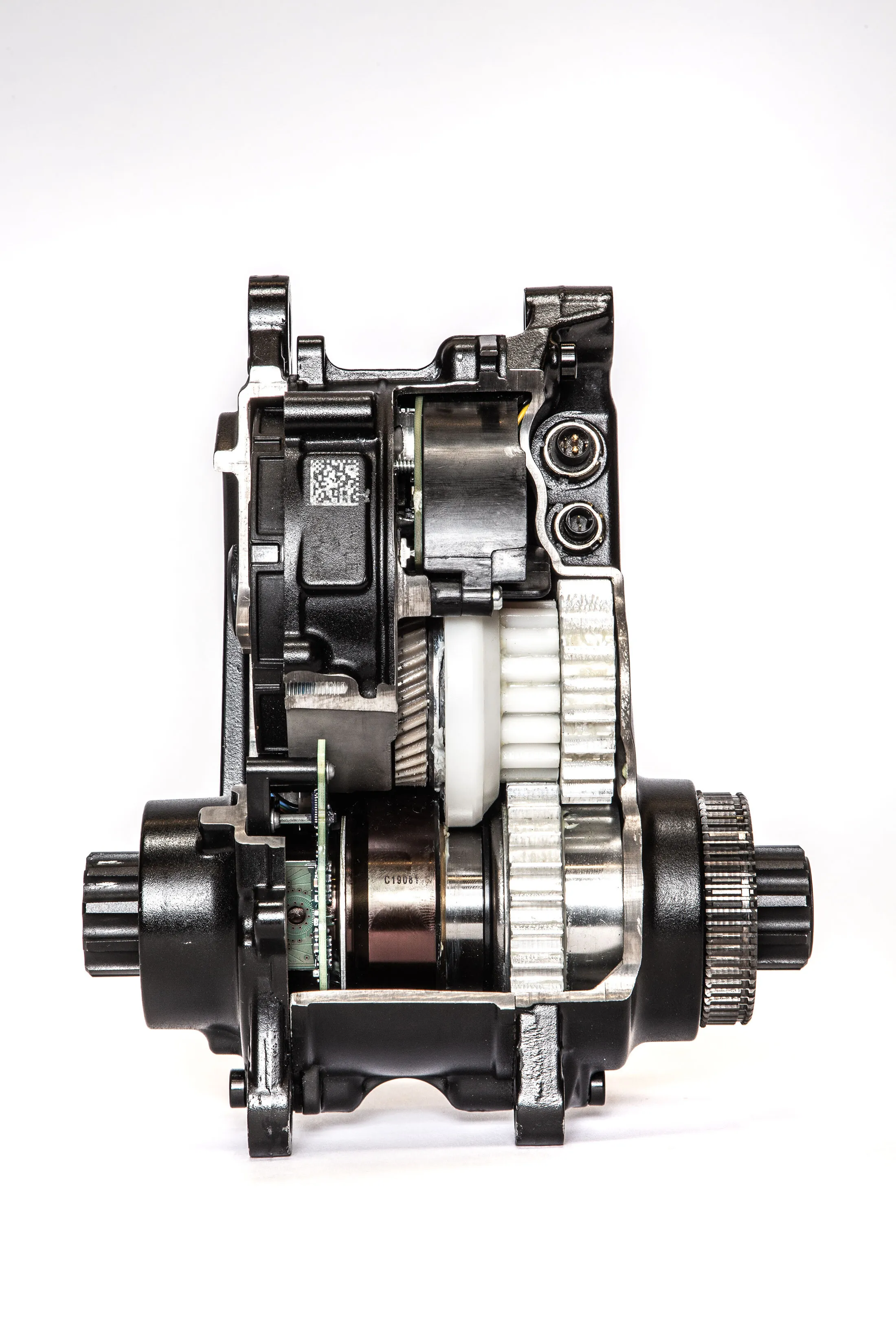 揭示了Specialized的Turbo Levo SL的SL 1.1电机和内部线路的剪裁,拍摄于该公司位于加利福尼亚州摩根希尔的总部。