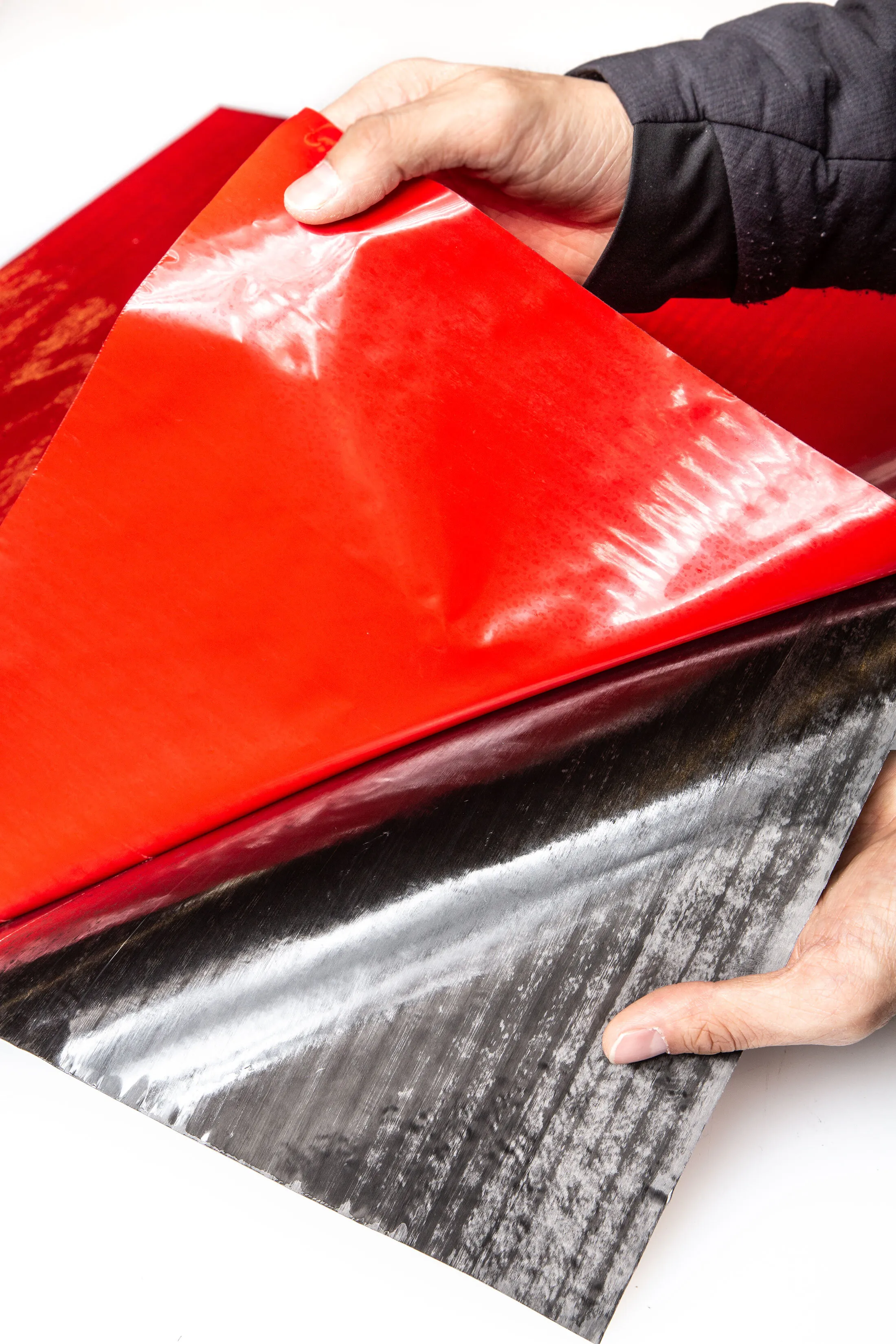 红色背衬从0.1毫米厚的碳纤维预浸料中去除。然后将碳纤维层熔合在一起,形成完整的碳纤维框架。摄影师:马丁·克利梅克,彭博商业周刊