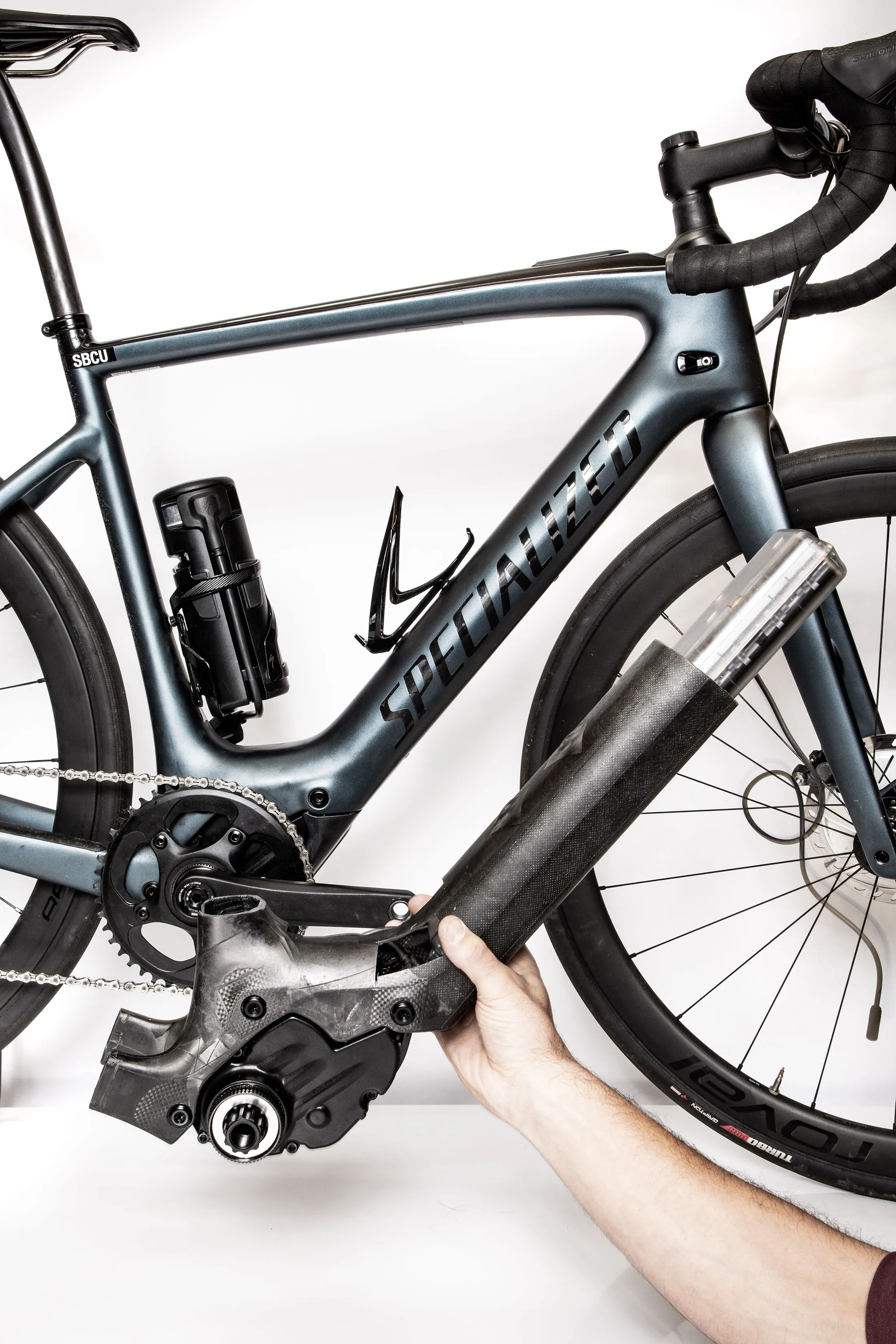 Turbo Creo SL的电机和电池的剖面图,展示在碳纤维底盘上,这是一款轻量级电动公路自行车。摄影师:Martin Klimek,来自彭博商业周刊