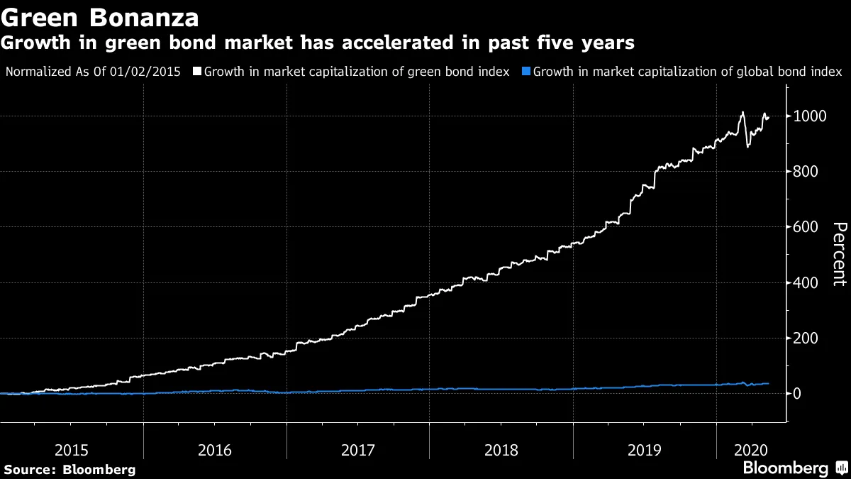 但即便在2019年绿色债券销售创下 $2170亿 的纪录,这个金额在全球债务 市场中仅是微不足道的一部分。它远远无法满足投资者的持续需求,也无法帮助他们将气候风险定价纳入主权债券。
