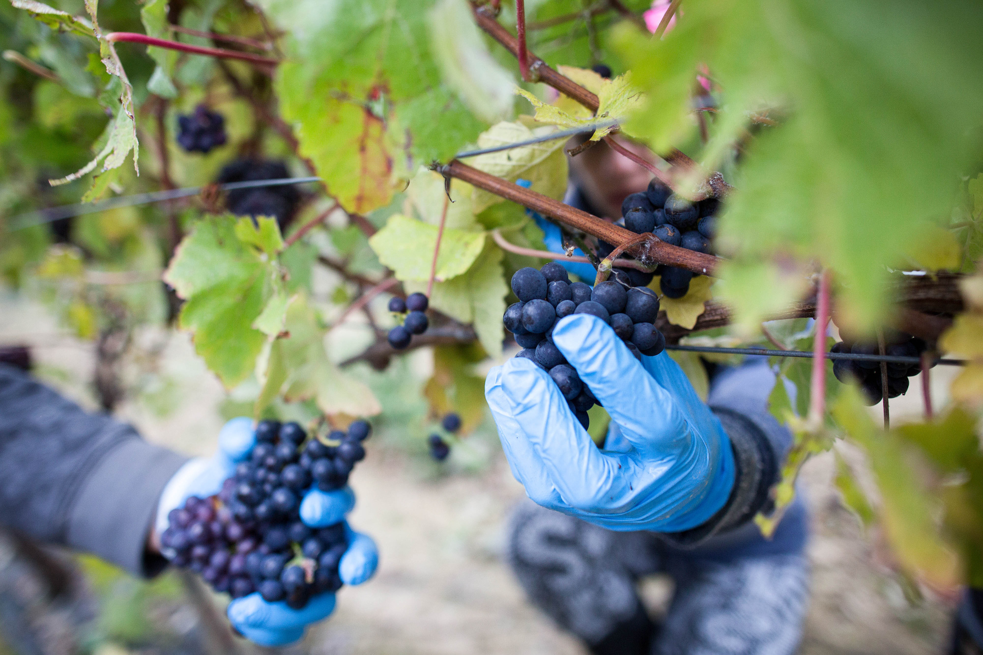 工人们在英国萨塞克斯的葡萄园里采摘黑比诺葡萄。