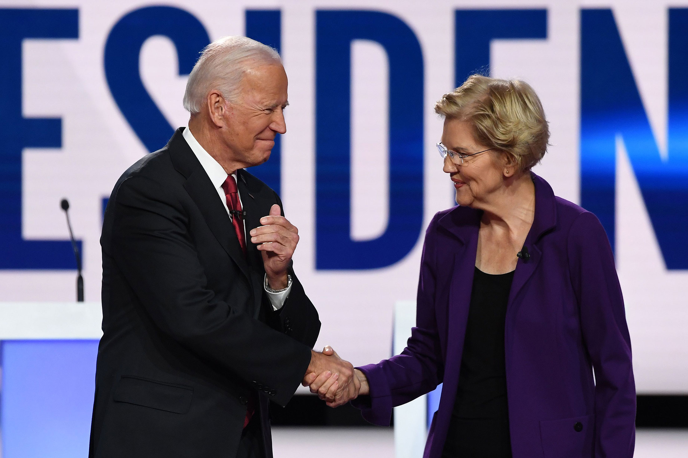 前副总统乔·拜登和参议员伊丽莎白·沃伦在2019年10月15日的第四场民主党初选辩论前握手。