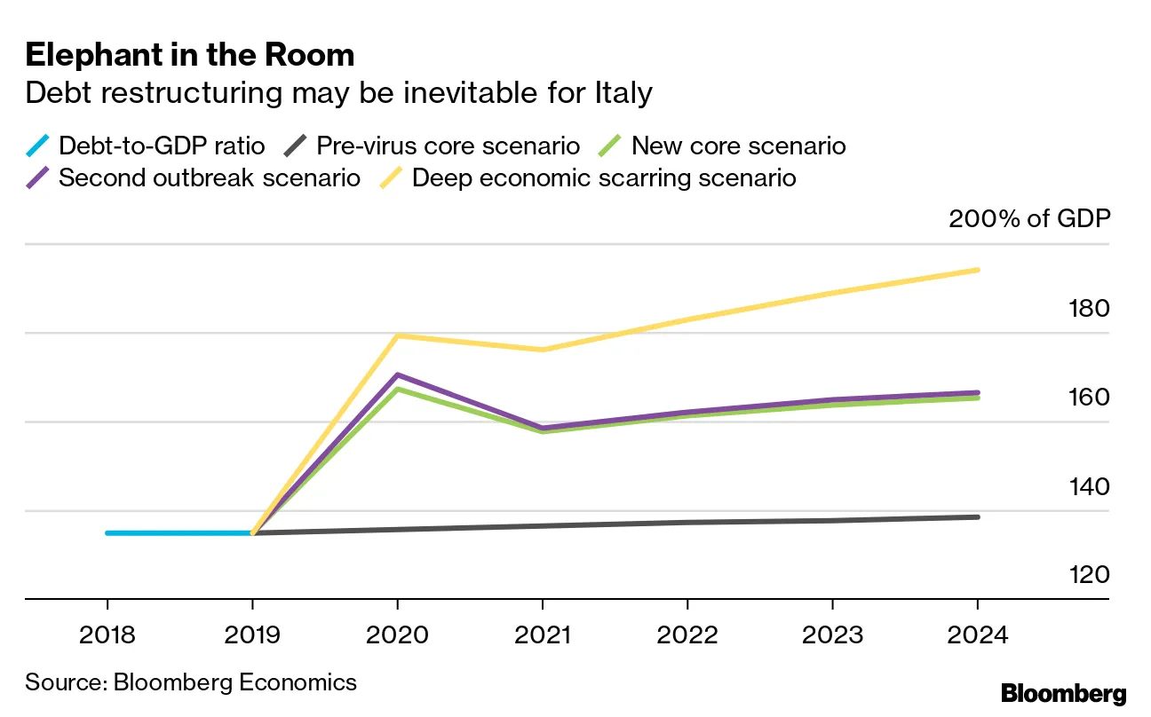 意大利的债务面临失控的风险,而借贷成本的逐渐上升显示投资者开始感到紧张,彭博经济学表示。如果新冠病毒造成长期损害,低增长加上政府支出可能会使债务远超国内生产总值的150%。这将强化人们对该国需要更多来自欧盟的财政支持的看法,甚至提出重组的问题。