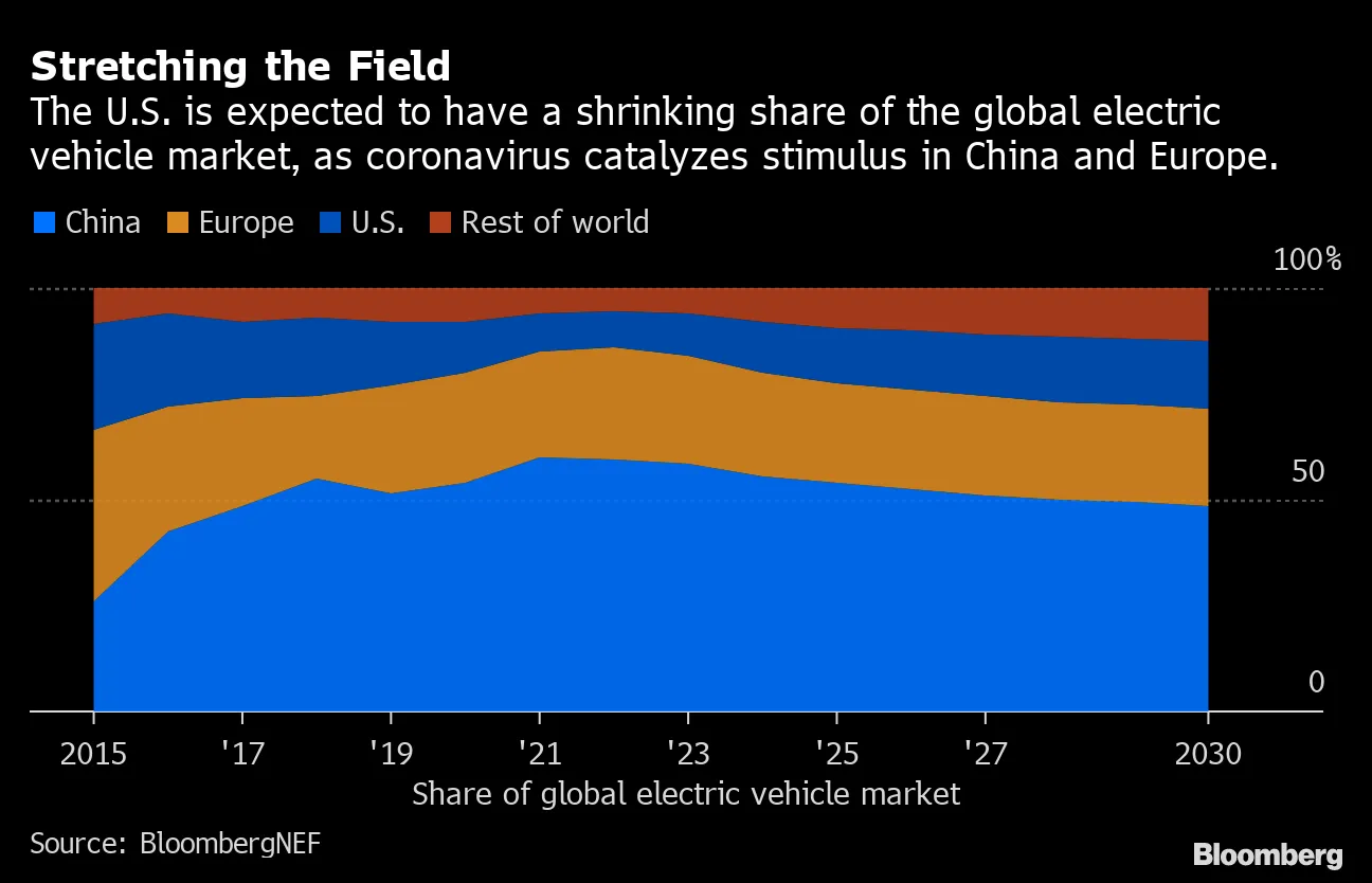根据今天由BloombergNEF发布的预测,疫情重创的经济预计将在中国、欧洲以及致力于通过财政刺激和基础设施支出推动电池动力的国家中给电动汽车带来提振。 然而,在美国,随着政策支持减弱和资金紧张的汽车制造商重新聚焦于其最盈利的产品,即燃油卡车和SUV,电动汽车的销售将在未来几个月大幅放缓。