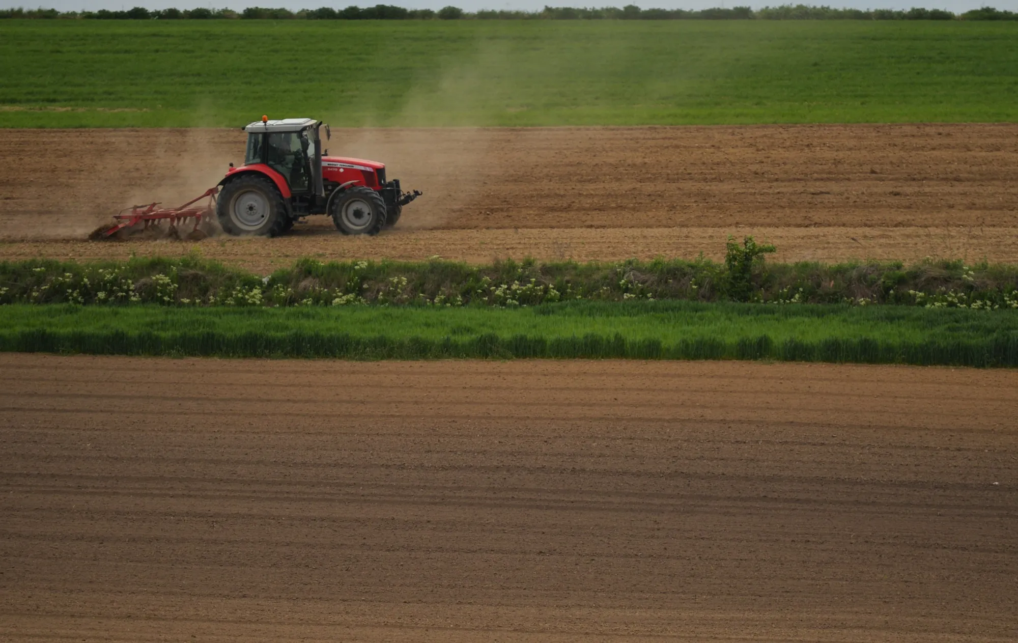 一辆拖拉机在波兰诺韦布热斯科附近的农田上扬起尘土,时间是5月13日。