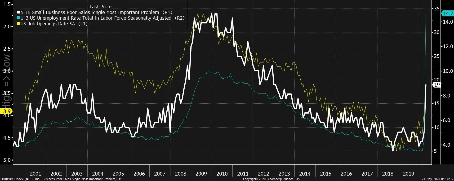好的,这一切听起来都不错,但实际上有任何证据吗?请查看下面的图表。在每月的NFIB小企业乐观调查中,他们问公司的一个问题是识别目前最大的商业问题是什么。加粗的白线是指出“销售不佳”作为最大挑战的企业百分比。白线与黄色线很好地对应,黄色线是美国的职位空缺率,由JOLTS调查测量。这是有道理的。随着收入问题越来越少(就像过去十年大部分时间一样),职位空缺率也随之增加。最后,青色线是失业率,再次,它很好地对齐。