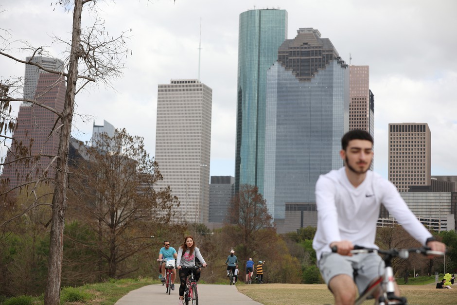 休斯顿市中心的巴法罗湾公园里的骑自行车者。德克萨斯州的这座城市最近通过了一项雄心勃勃的气候和公共交通计划。香农·斯坦曼/Bloomberg四月本应是休斯顿城市规划的重要月份。美国最大的无规划城市准备首次主办美国规划协会的全国大会,吸引成千上万的与会者来到这里。安排了步行游览;尴尬的鸡尾酒会也已安排。