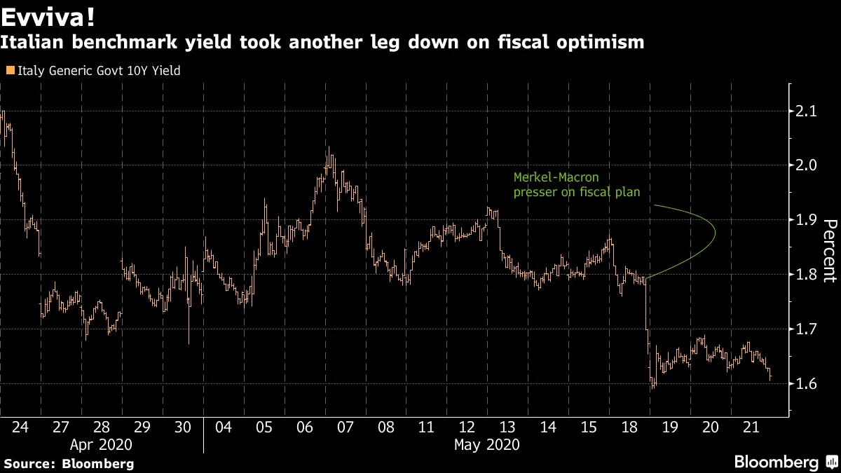 如果安格拉·默克尔和埃马纽埃尔·马克龙期待对他们联合拯救欧盟免受疫情侵害的提议作出热烈反应,他们可能会感到失望。欧洲市场对德国和法国领导人之间关于可能的5000亿欧元方案的初步协议反应平淡。意大利的反应最为明显,10年期收益率下降了20个基点,使与德国的利差缩小到一个多月以来的最低点。