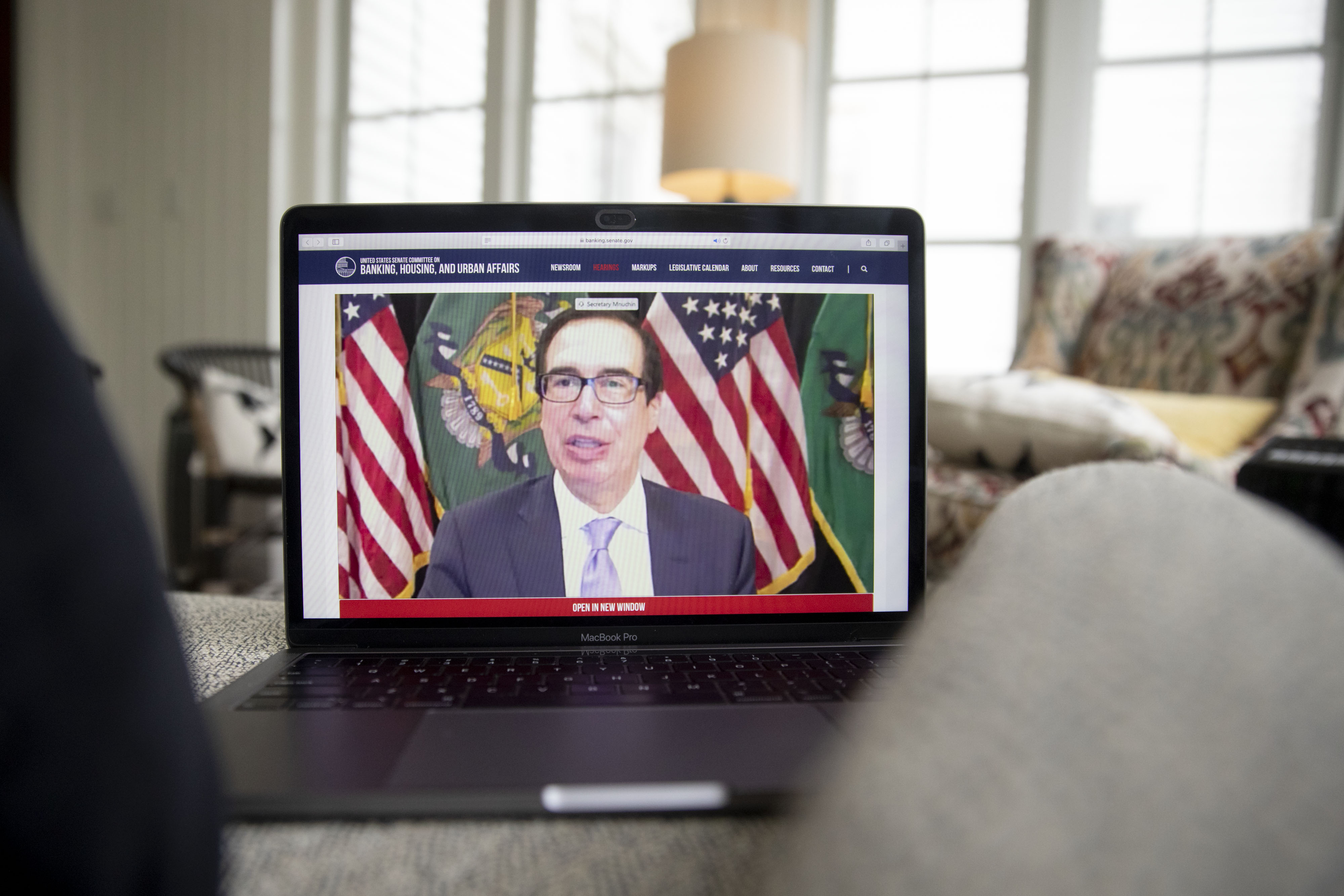 美国财政部长史蒂文·姆努钦在2020年5月19日星期二于伊利诺伊州蒂斯基尔瓦的笔记本电脑上观看的虚拟参议院银行委员会听证会上发言。