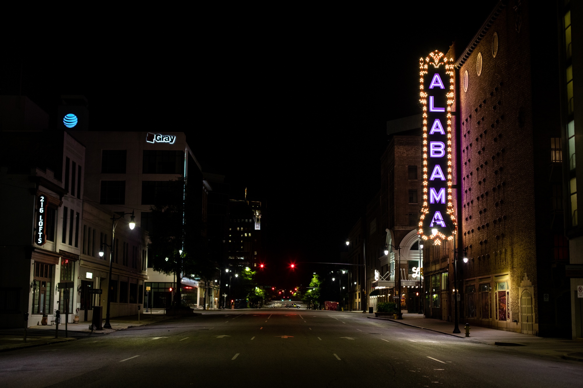 4月28日,在阿拉巴马州伯明翰,一条空荡荡的街道在夜间显现。