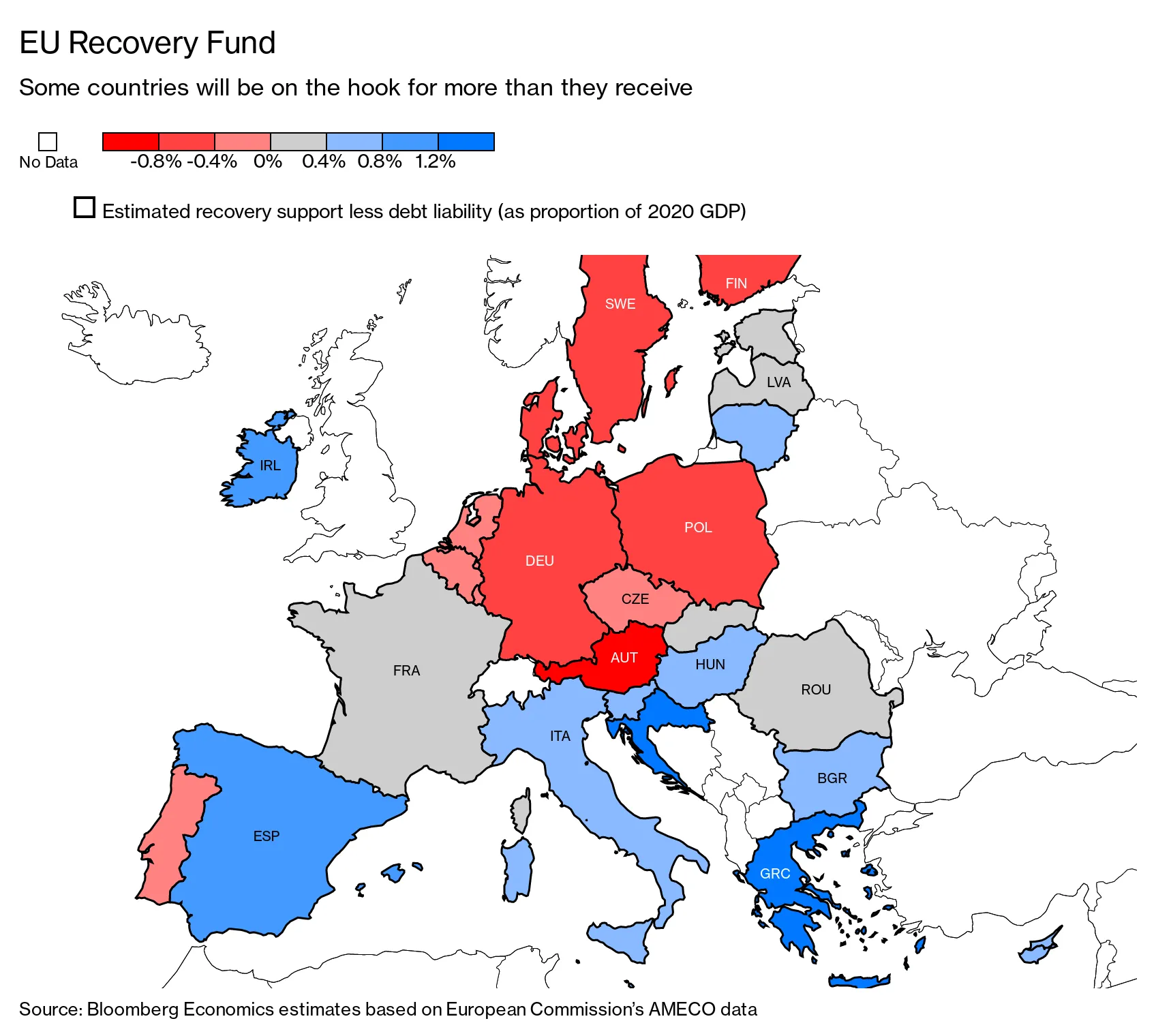 利用欧盟委员会的增长预测下调来识别哪些经济体最需要帮助,并假设新债务按经济实力分配,彭博经济学**对法德提议的5000亿欧元复苏基金的赢家和输家有一个初步估计。