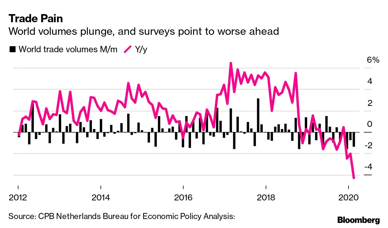 全球贸易在三月份遭受了十多年来最大的打击,当时冠状病毒的传播开始对企业造成越来越严重的影响。全球贸易量比一年前下降了4.3%,这是自2009年以来的最大降幅。按月计算,贸易量连续第三个月下降1.4%。这一下滑只是封锁措施对抗疫情造成损害的初步迹象,调查显示深度衰退正在进行中。