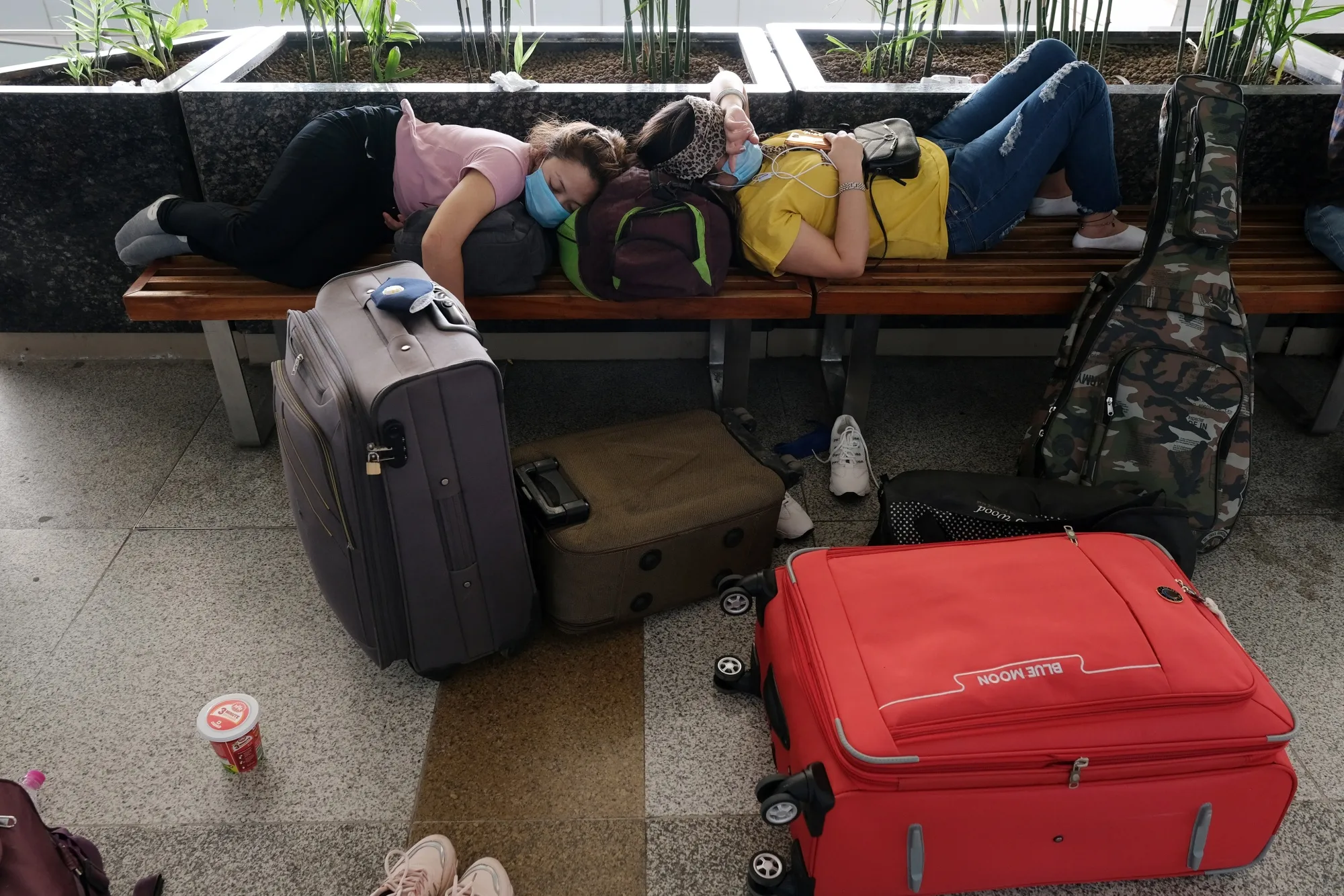 旅行者在德里机场的长椅上休息,日期是5月25日。摄影师:T. Narayan/Bloomberg