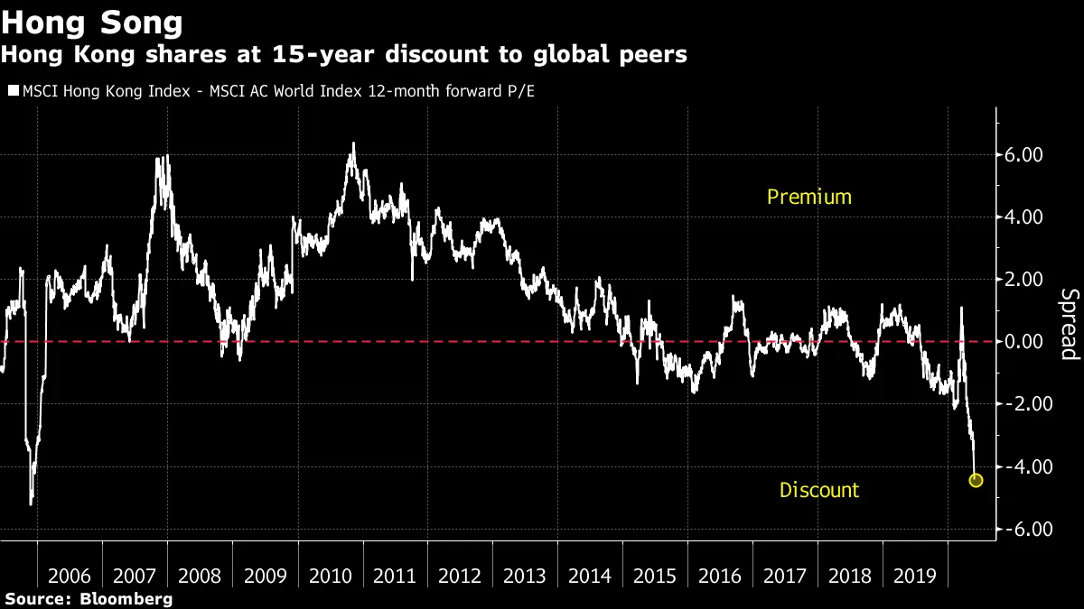 香港再次成为金融市场关注的中心。由于中国对异议的严厉打压,该市的基准股票指数在周五创下五年来最大跌幅。周一在周末抗议活动恢复后继续下跌,周二趋于稳定。在新的安全法和冠状病毒疫情之间,投资者对当前事件的看法比去年动荡时更加严肃——香港股票估值已降至15年来对全球同行的最低水平。MSCI香港指数——其国内关注度高于以中国为重的恒生指数——的交易价格约为未来收益的14倍,而MSCI全球指数则超过18倍。虽然这可能引起价值投资者的关注,但分析师可能尚未考虑到如果抗议活动升级,城市将面临另一个夏季的不满。这是可以理解的,因为他们已经面临艰巨的任务,试图评估冠状病毒带来的经济冲击。中国的举动代表了对“一个国家,两种制度”框架的最大挑战,而这一框架支撑着香港的许多金融吸引力。反击才刚刚开始。这表明香港股票将继续在全球同行中处于低迷状态。