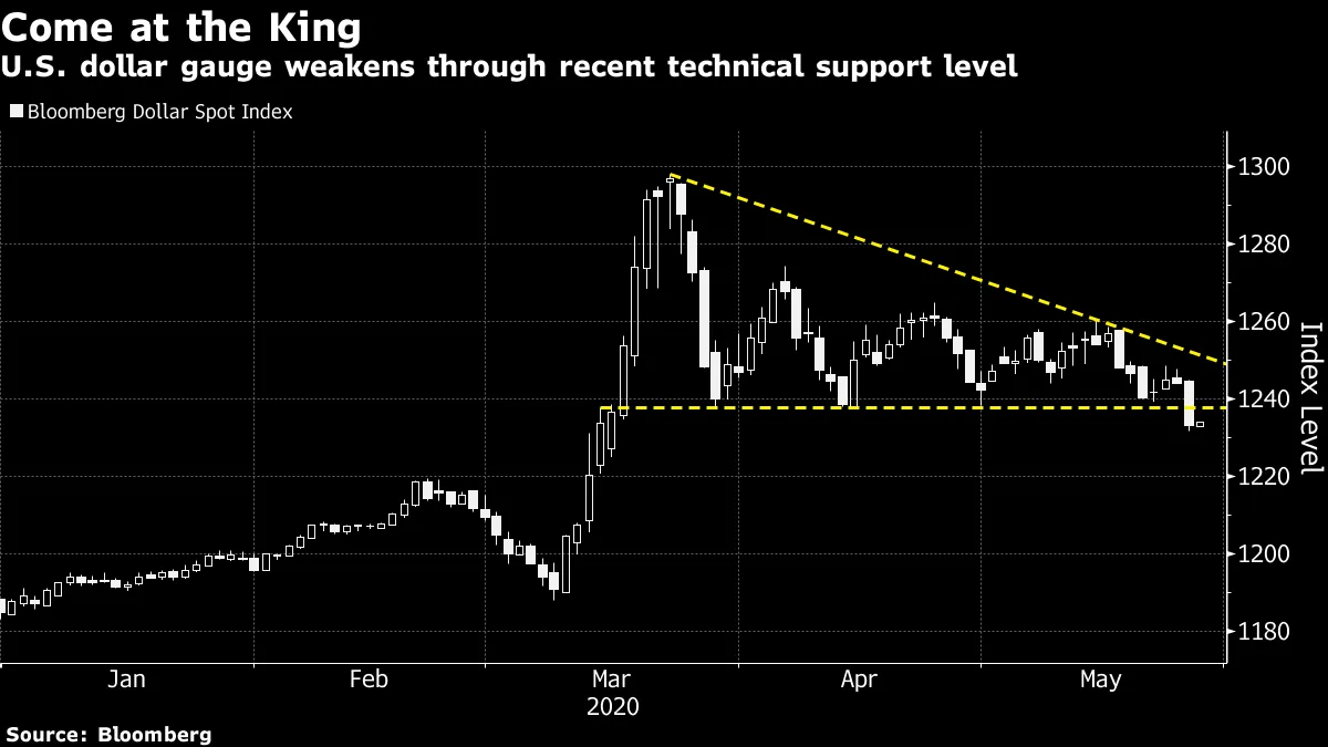 美元处于弱势。在对技术交易者的看跌信号中,彭博美元现货指数突破了一个关键支撑线,该支撑线在过去两个月中曾四次反弹。该指数周二下跌了多达1%,达到自三月以来的最低水平,因为投资者在全球经济重新开放的进一步迹象中避开了避险资产。疲软的美元将为一系列风险资产提供良好的背景,尤其是来自新兴市场的资产。但问题在于,这个问题很大。虽然支撑位的突破为美元进一步下跌打开了大门,但交易者首先会关注这一走势是否能够维持,因为美中紧张局势的重新升温可能会影响投资者情绪。中美争端的升级,例如对香港的制裁或重新考虑其特殊贸易地位,可能会迅速导致美元疲软的逆转,并恢复风险厌恶的环境。