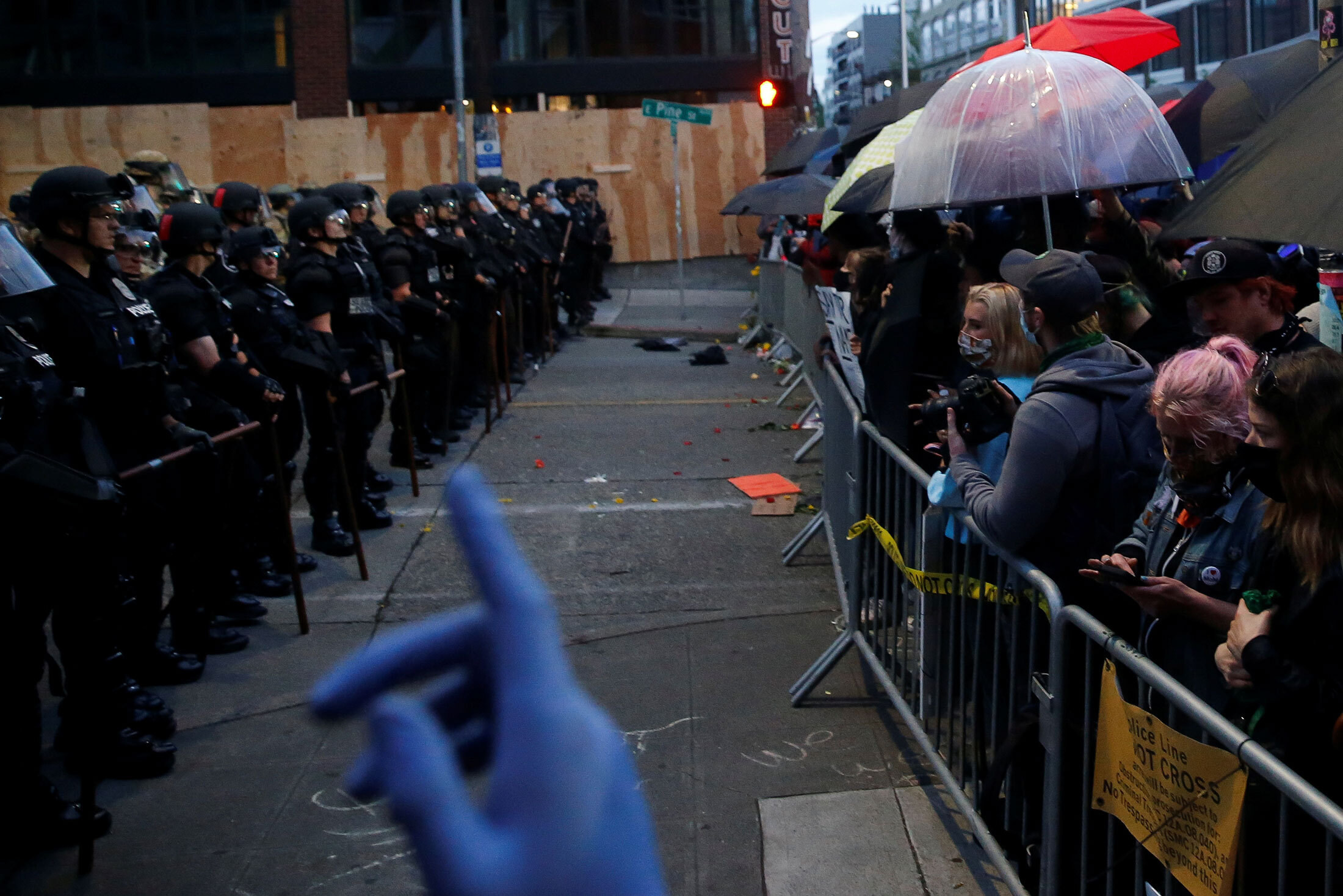 一名抗议者举起戴着手套的手,西雅图警方与抗议者在该部门东警察局外面对峙。抗议者们举着雨伞以保护自己免受催泪瓦斯和胡椒喷雾的影响。