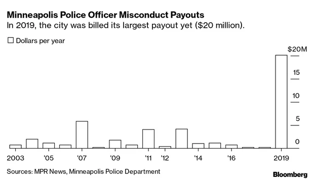 明尼阿波利斯已经非常清楚这可能给城市带来多大的费用——它在2003年至2019年间为警察不当行为支付了超过2500万美元,其中包括2019年一次支付的2000万美元,仅仅是因为警察杀害了贾斯廷·鲁斯基克。该市同意支付近80万美元以赔偿警察杀害特伦斯·富兰克林的事件。