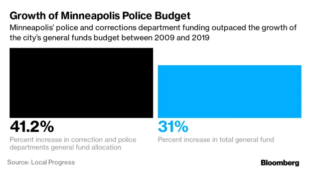 根据地方进步组织,一个地方选举官员的联盟**,**明尼阿波利斯的警察和惩教部门的资金在2009年至2019年间增长了41%——在此期间超过了城市一般基金的增长——并在2019财年占一般基金的37%。