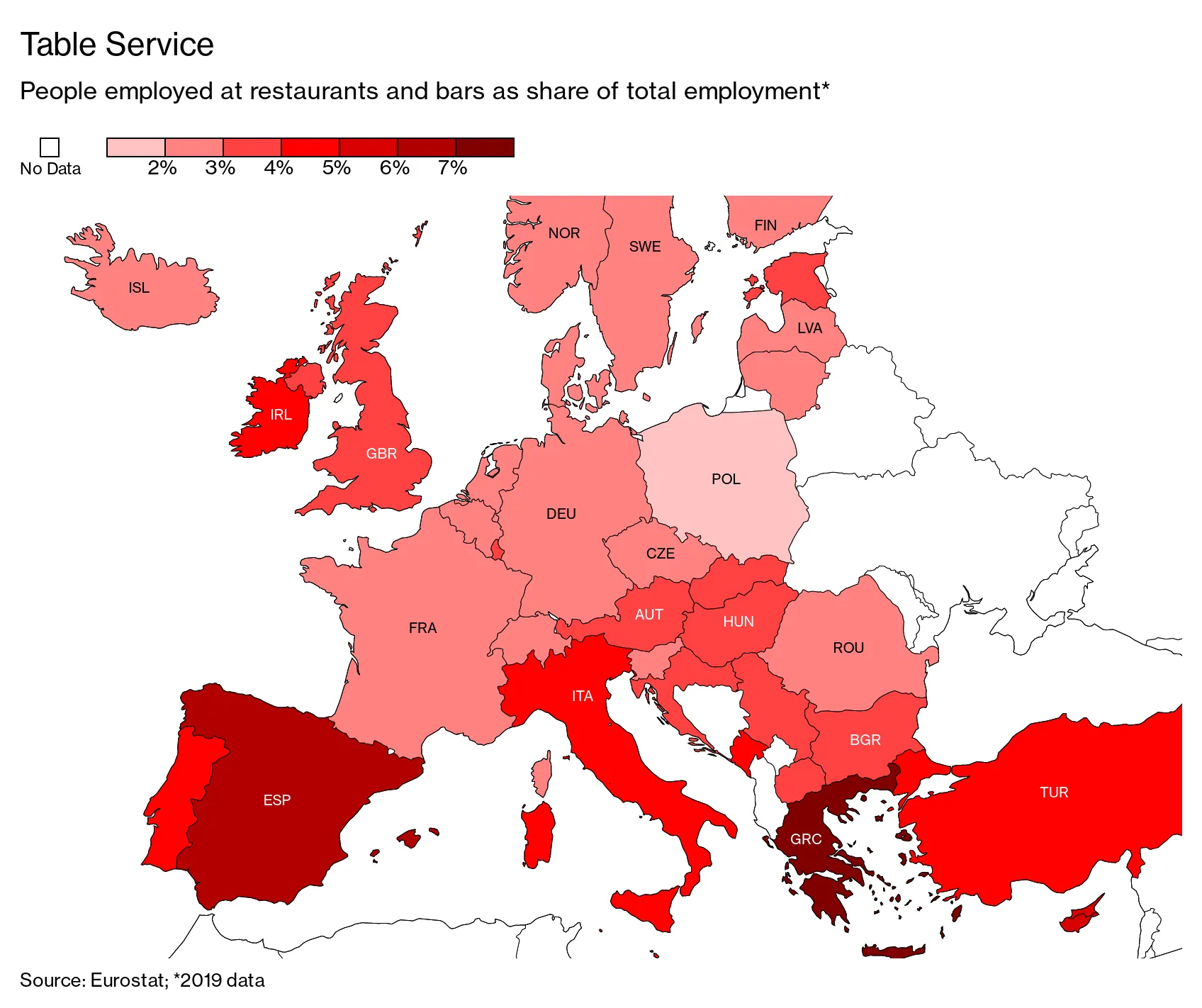 随着该地区因新冠病毒引发的封锁措施解除,欧洲的餐馆和酒吧正在重新开放。但预计需求在一段时间内会较弱,社交距离将压缩收入。这对西班牙和希腊来说是坏消息,因为餐馆和酒吧在就业中所占的比例在欧盟中最高。