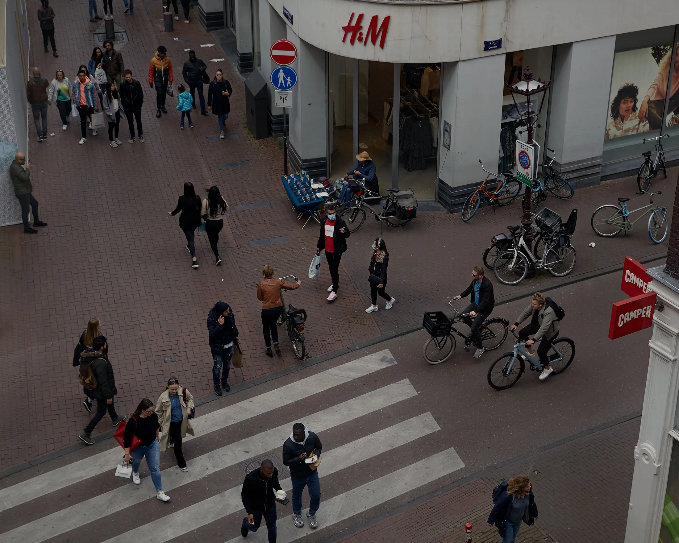 在3月12日,荷兰首次确诊Covid-19病例两周后,首相马克·吕特召开了一场新闻发布会,他请求——请求,而不是命令——全国每个人尽可能在家工作。两天后,Locatus的数据表明,像Kalverstraat这样的繁忙零售街道的客流量下降了大约80%。在巴黎和马德里,国家政府实施强制居家措施后,目的地购物街的访客减少了约95%,Zandbergen在我们坐在长椅的两端保持适当距离时告诉我。