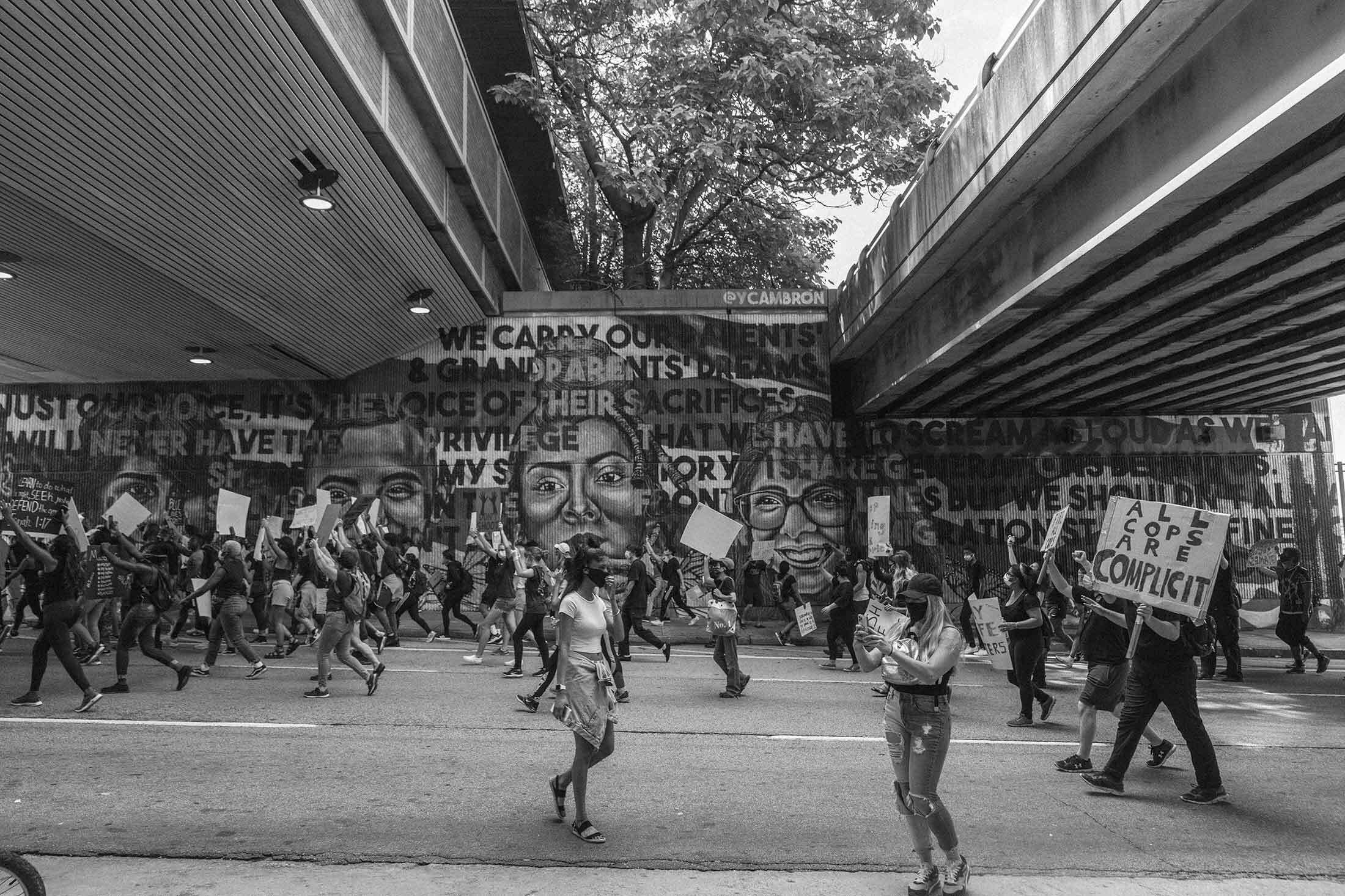 人们在5月29日穿过市中心,朝乔治亚州国会大厦游行。