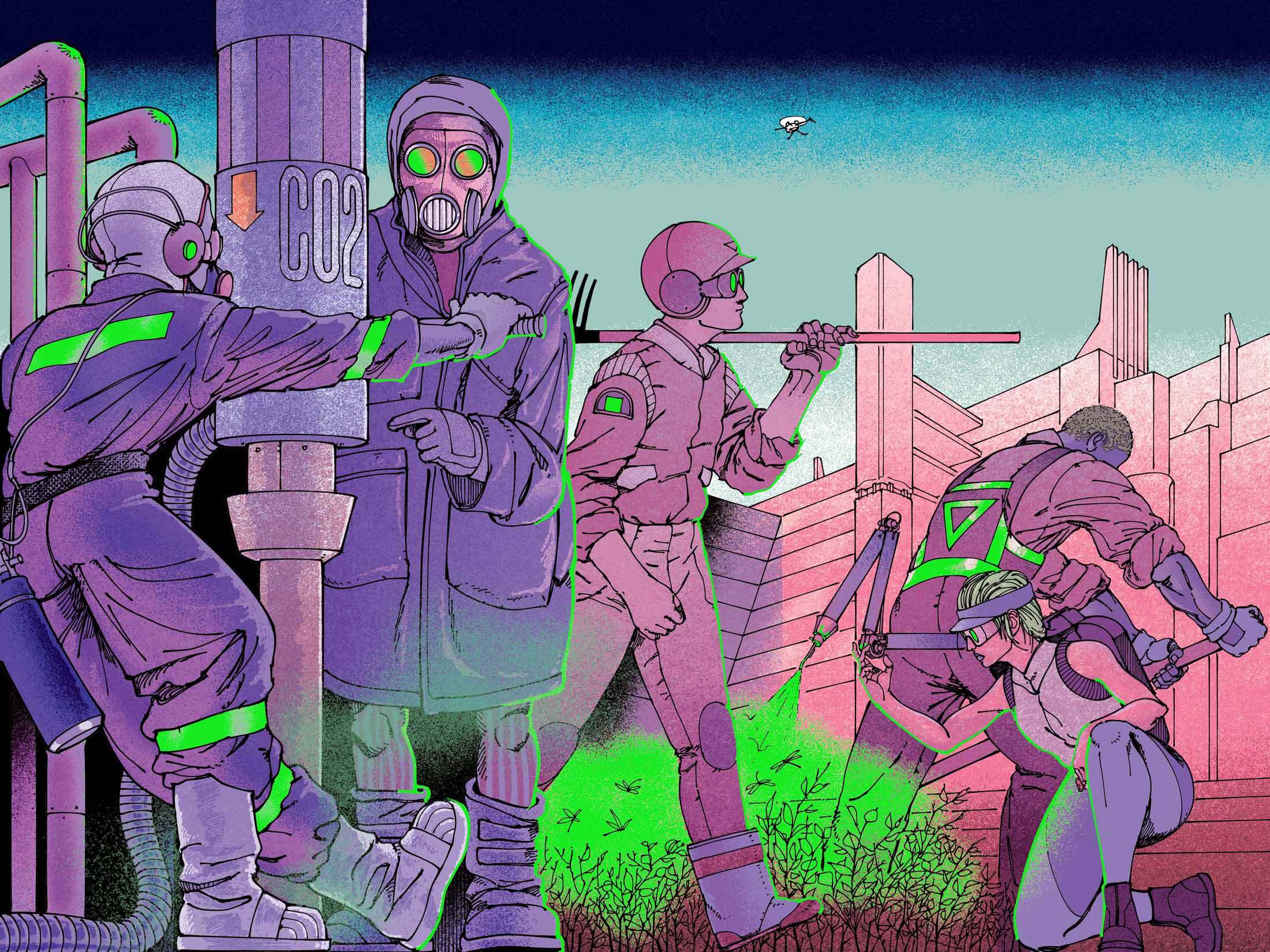 你去当地的就业中心,那里告诉你美国能源部正在赞助一家公私合营公司来建设直接空气捕集工厂。现在,你不再是从地下抽取二氧化碳,而是从大气中吸取CO₂并将其注入地下。你已经知道如何使用泵和管道,因为你以前的工作,尽管CO₂去除是一个新行业,但它正在快速扩展。而且你有真正的工作权利,正如《联合国人权宣言》中所述——而且,自《大流行恢复法》通过以来,这在联邦法律中也得到了体现。好工作就是好工作。
