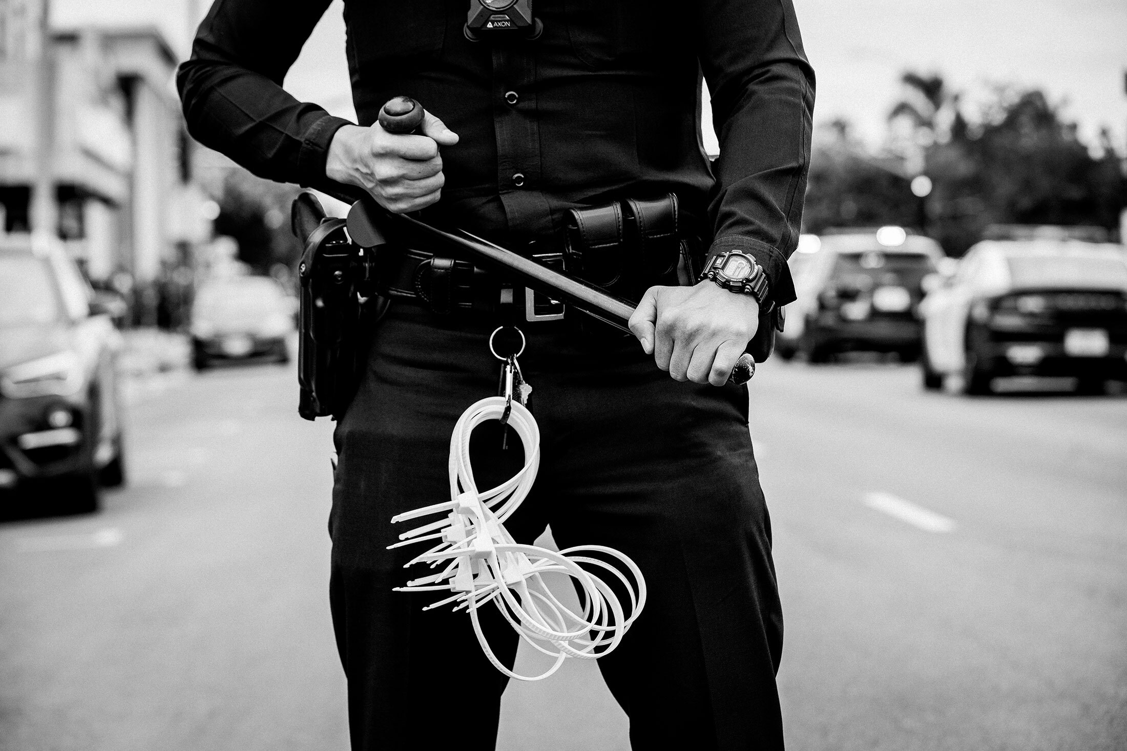 5月30日,在洛杉矶的费尔法克斯区,一名洛杉矶警察局的警官手持警棍和拉链手铐。