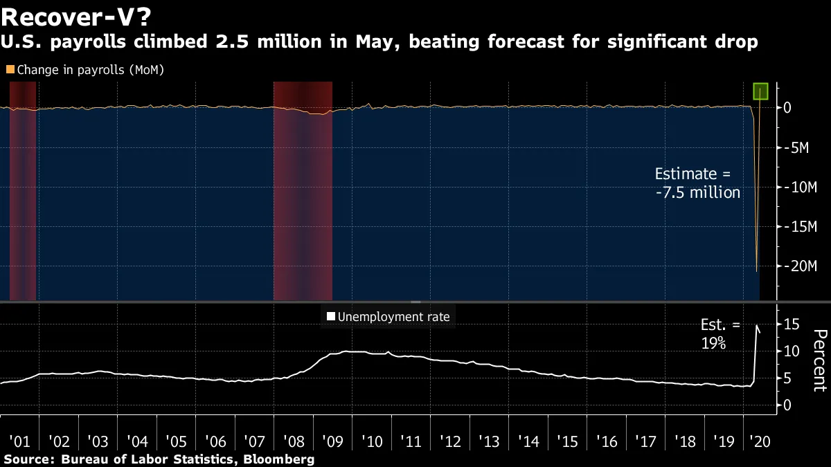 突然之间,出现了很多V形图表。最大的一个是上周五发布的美国非农就业报告,令所有人震惊的是,该国在5月份意外增加了创纪录的250万个就业岗位。经济学家原本预测将失去750万个就业岗位,这意味着我们刚刚见证了有史以来最大的预测失误。我在这里不打算详细讨论就业报告——只需说,各种数据错误的猜测层出不穷。