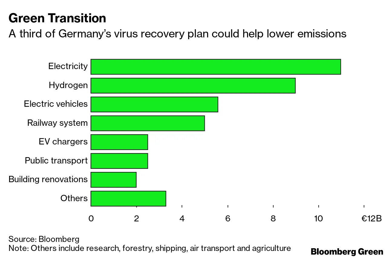 德国的1300亿欧元复苏计划将重点放在气候友好的产业和技术上,强调安格拉·默克尔承诺重启经济并使其摆脱化石能源和污染汽车。该计划分为57个不同的要点,涉及税收、家庭和农业等领域,分配约410亿欧元用于公共交通、电动车和可再生能源等领域,根据彭博新闻的计算。