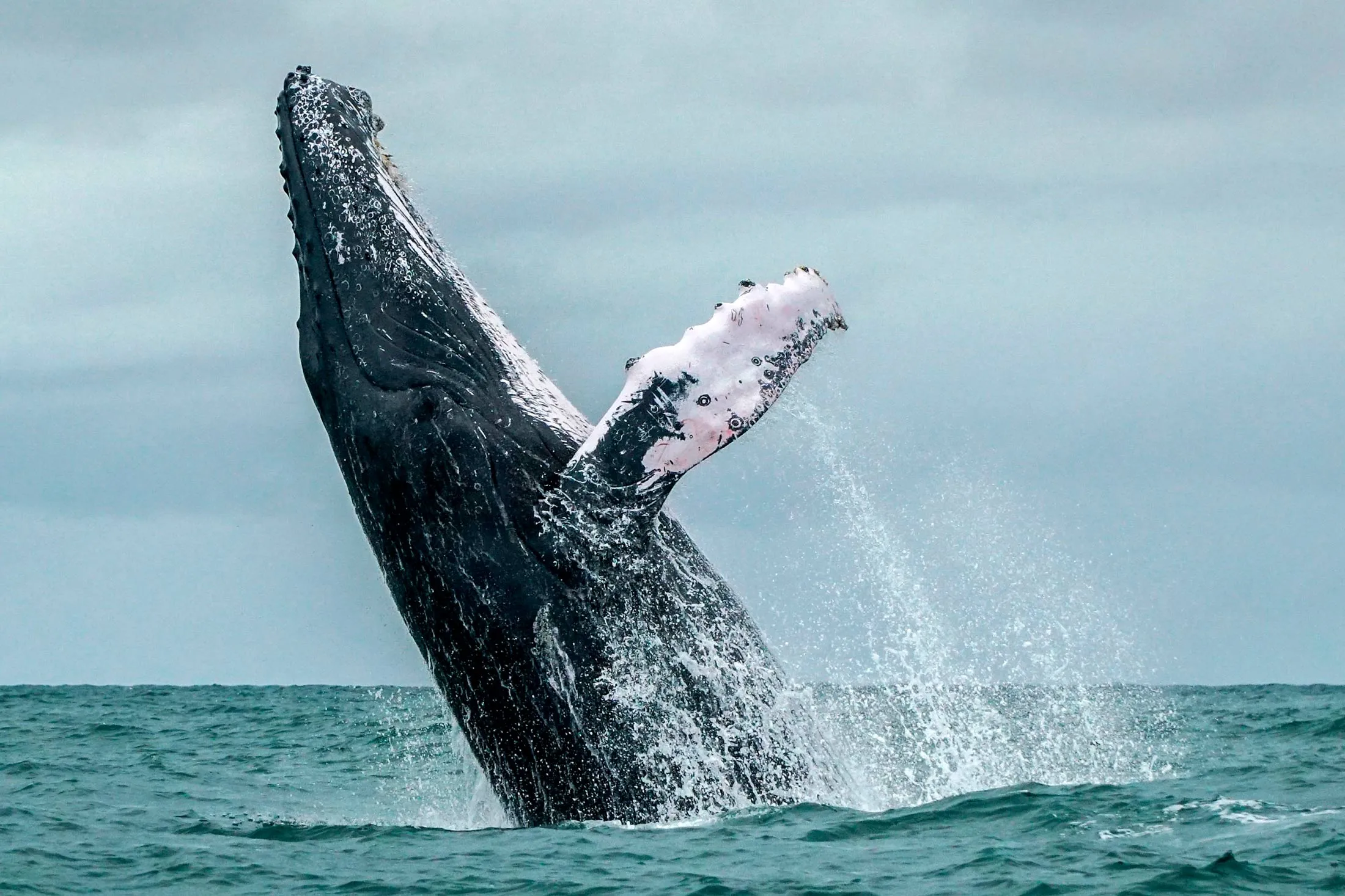 一只座头鲸在太平洋的水域中跳跃。