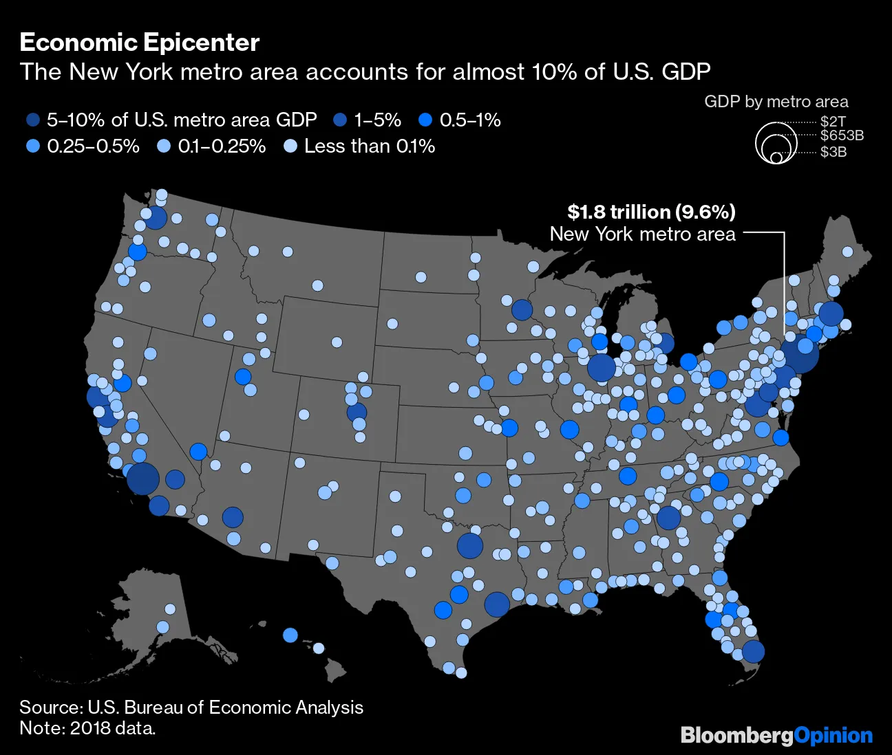 目前,你仍然不能挤在Just Salad的队伍里,你在地铁上必须戴口罩。但这些可能都是改善生活的变化。如果你不住在那里,你可能对纽约人的所作所为无动于衷,甚至感到敌意。但没有哪个城市对整个美国经济的意义比这更大,写道布莱恩·查帕塔和艾琳·何,用许多引人注目的图表来说明他们的观点: