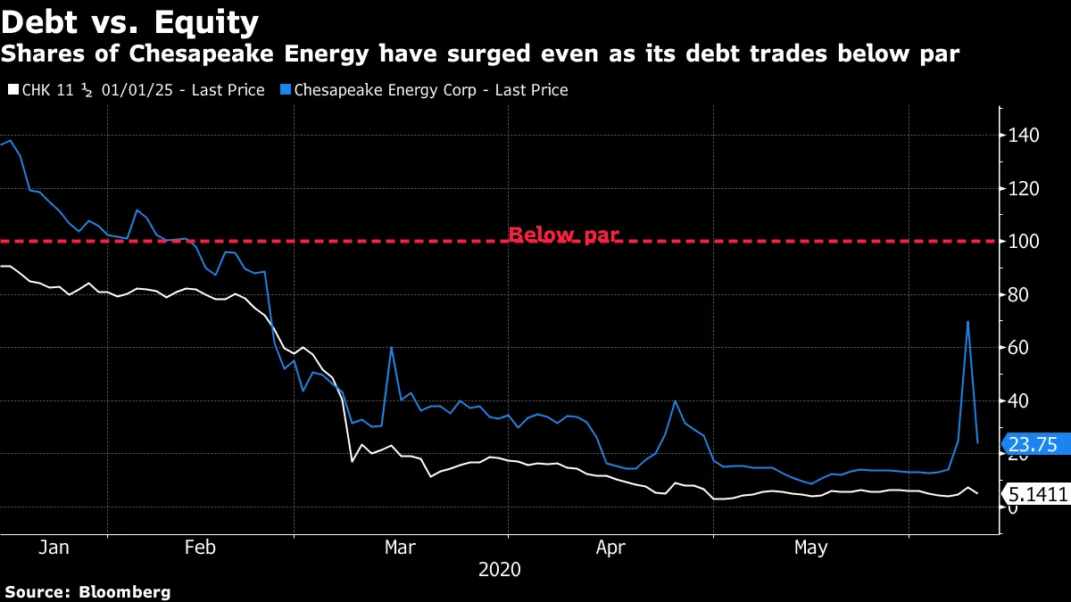 所有这些的奇怪结果是,你基本上可以通过在Hertz申请第11章保护的当天投资来翻倍你的资金。切萨皮克能源的股票在一周前交易价格为14.05美元,在公司周二宣布可能申请破产之前,股价攀升至近70美元;现在交易价格为23.75美元。挣扎中的百货公司连锁JC Penney的股票交易价格为20美分,现在为43美分(曾达到68美分)。更奇怪的是,这些公司的许多债券仍然低于面值交易,这表明债务投资者真的不认为在清算中能收回多少资金。如果债券投资者预期会亏损,那么股权投资者*应该*通常预期会被抹去。但当然,我们并不处于正常时期。绝对不是。