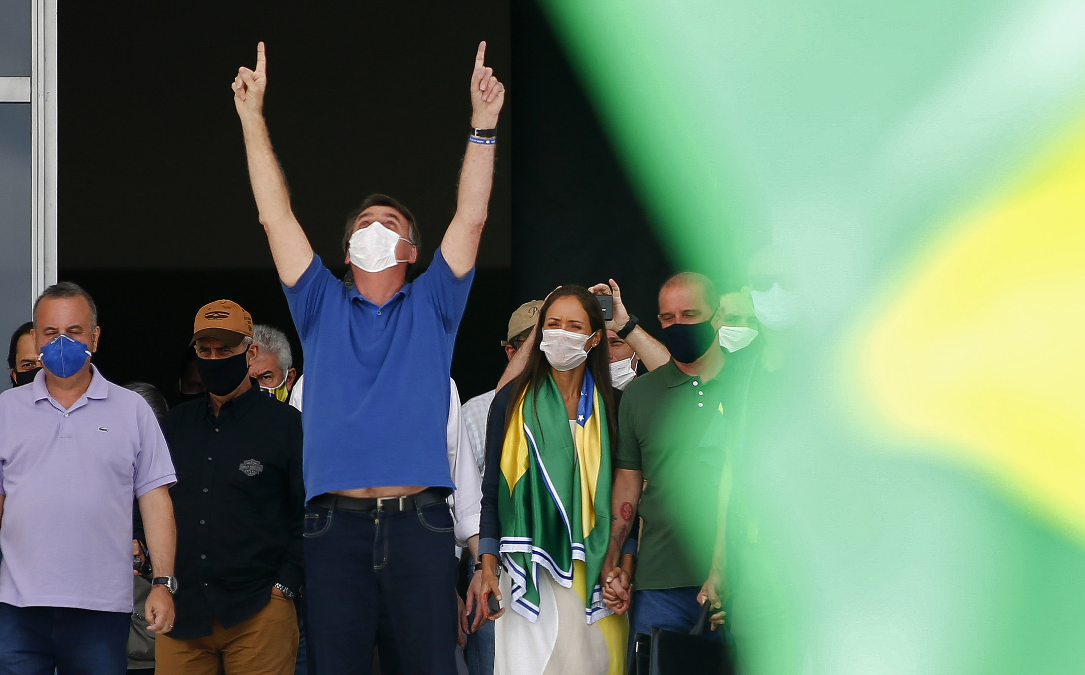 巴西总统贾伊尔·博索纳罗在2020年5月17日的巴西利亚集会上做手势。
