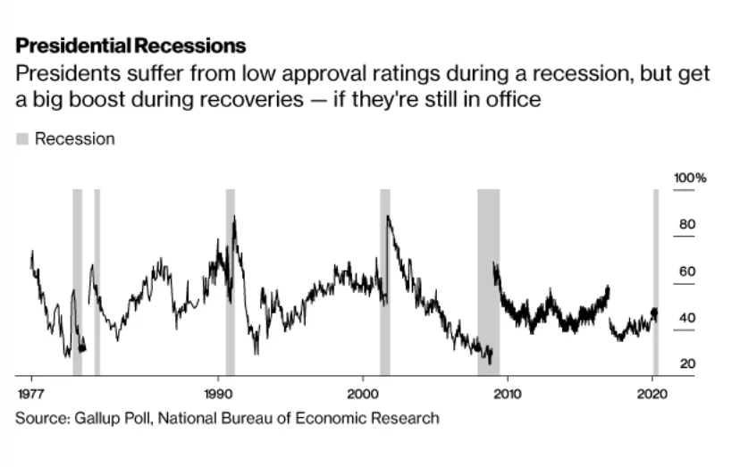 选民通常会在选举年经济衰退时罢免总统及其政党。我们知道这一点,因为NBER有数据测量商业周期并宣布衰退的开始和结束自1850年代以来,当时富兰克林·皮尔斯担任总统。