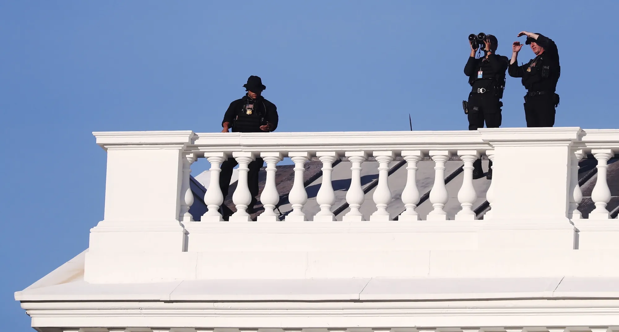 白宫屋顶上的特勤局特工,特朗普(未拍摄)在6月1日与教堂外的一本圣经合影后返回。摄影师:肖恩·修/Bloomberg