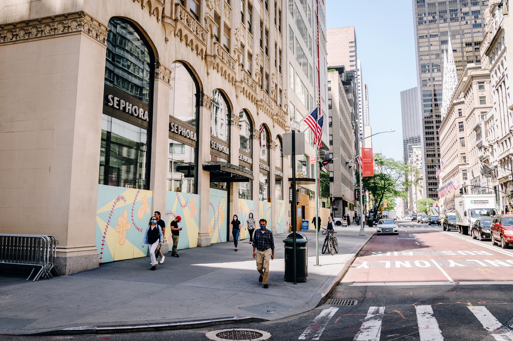 行人戴着防护口罩在纽约第五大道一家封闭的Sephora外走过,时间是6月9日。