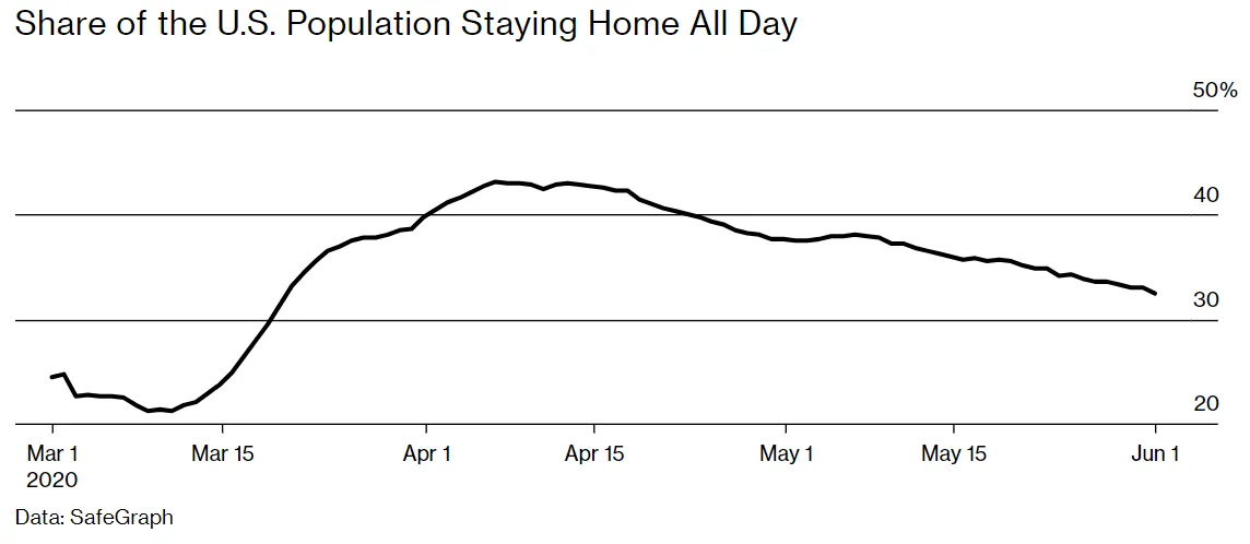 当美国开始实施社交隔离措施时, 位置追踪数据 显示更富裕的邮政编码地区的人们能够更早待在家中。现在, 只有三分之一 的美国人整天待在家中,彭博商业周刊报道。有人走出去参加反对种族不平等的抗议活动。