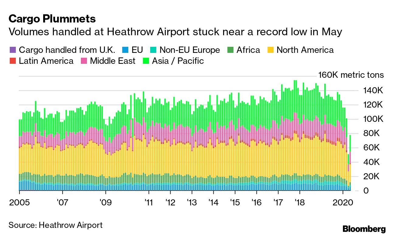 随着冠状病毒大流行继续严重影响需求和供应链,伦敦希思罗机场的货运量在5月份保持在至少自2005年以来的最低水平。尽管前往希思罗的货运航班数量有所增加,但货运量较去年下降了42%,因为大量货物通常是在商业飞机的货舱中运输。作为欧洲最繁忙的航空运营,机场开始裁减一线岗位,因为乘客数量的恢复——在5月份下降了97%——因英国本周对入境旅客实施的隔离规定而延迟。