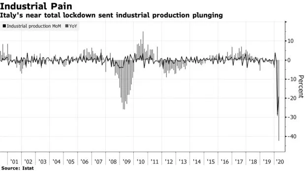 由于该国继续遭受几乎全面封锁以应对冠状病毒疫情,意大利的工业生产在四月份大幅下降。今天早上将公布整个欧元区的工业惨状的读数。