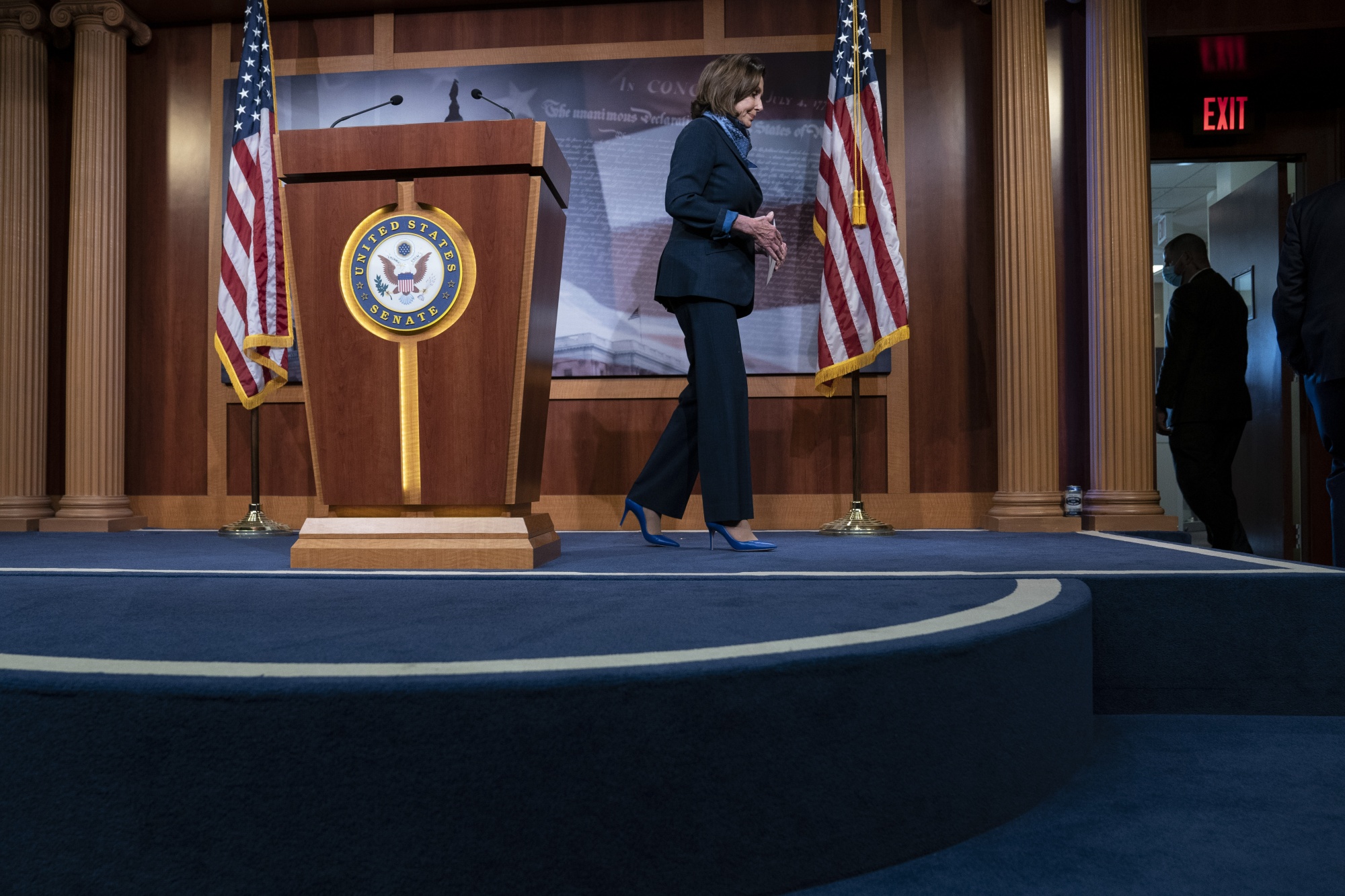 美国众议院议长南希·佩洛西于2020年4月21日在国会山的新闻发布会上离开。