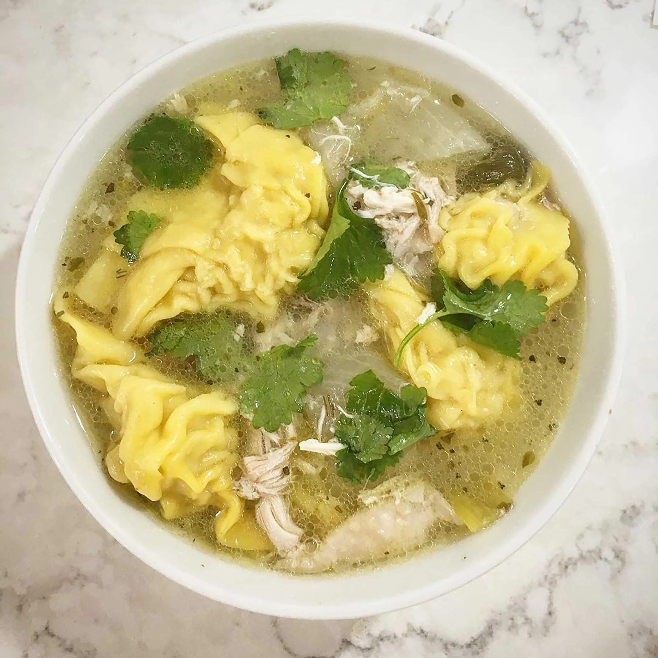 鸡汤:“所以我煮了一整只鸡——加上韭菜、洋葱、大蒜、青葱、胡萝卜、柠檬、生姜、胡椒粒、香菜和一些干香草——从头开始做鸡汤。没有马祖球,所以我放了一些猪肉和虾的馄饨。虽然不符合犹太教饮食法,但味道不错。现在我有足够的材料做一打碗汤。”摄影师:霍华德·蔡-厄昂有很多东西需要学习和重新学习:分辨小苏打和泡打粉;每次接触生鸡肉时洗手;测量水和米的正确比例;清理新鲜韭菜褶皱间的有机杂质;使用你重新水化香菇的美味水;解读我西门子烤箱和炉灶的奇怪运作和鸣叫声,伦敦人称之为灶台。还有在切洋葱时,手里握着洋葱,害怕得泪水夺眶而出,以免切掉指尖。这可能就是我最终的死法。