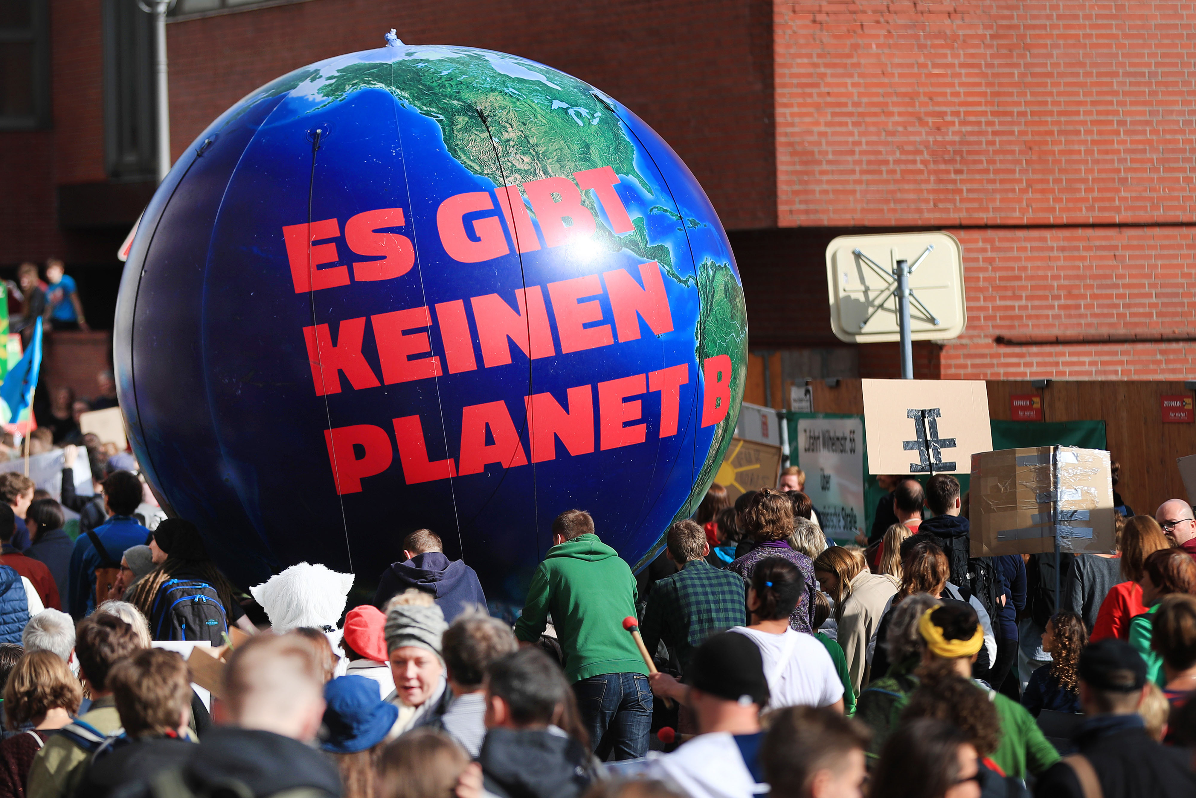 抗议者在2019年9月20日星期五于德国柏林的全球气候罢工示威活动中,靠近一个充气地球仪游行。