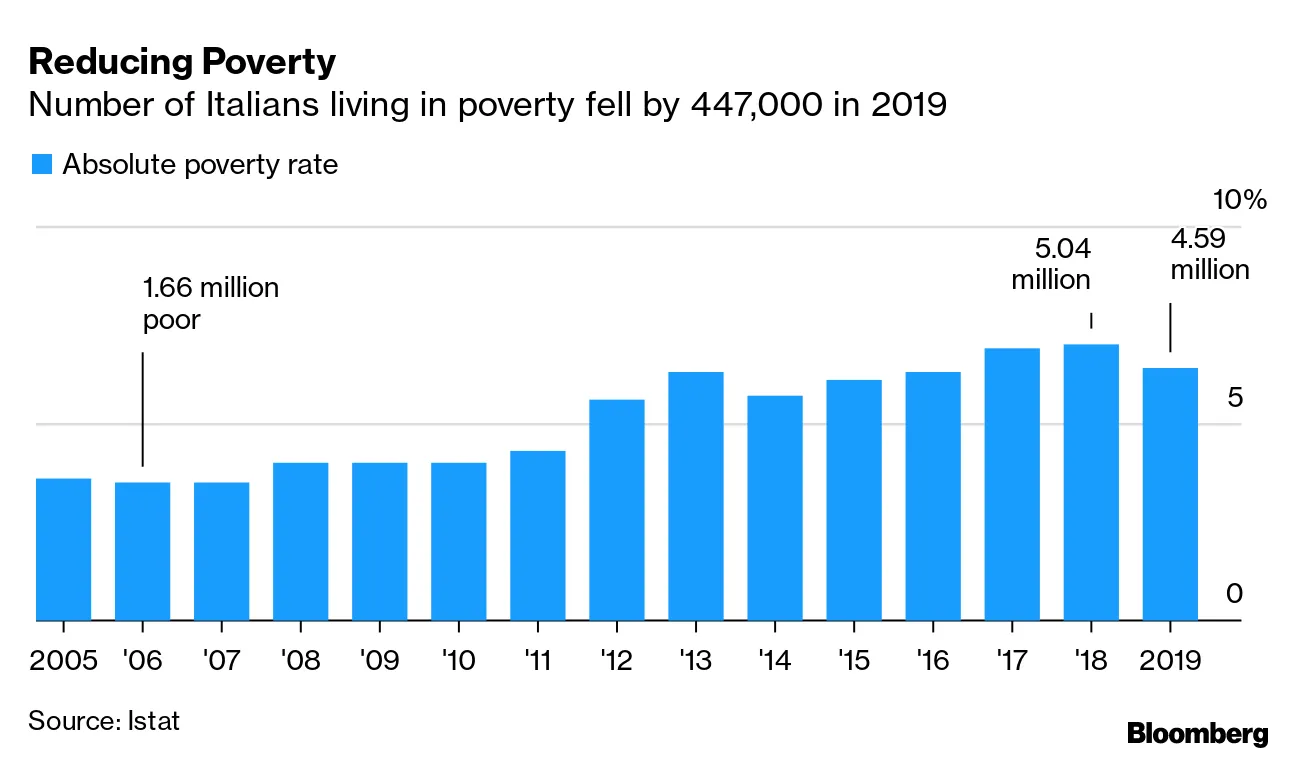 意大利的贫困率在五年来首次下降,在新冠病毒冻结全球经济之前,无法负担基本商品和服务的人数在2019年降至7.7%。这一减少与一项有争议的“公民收入”的推出相吻合,该收入目前每月向280万人支付平均519欧元(590美元)。由于与病毒相关的经济衰退将意大利推入严重衰退,失去工作,预计这一下降将是一次性的。
