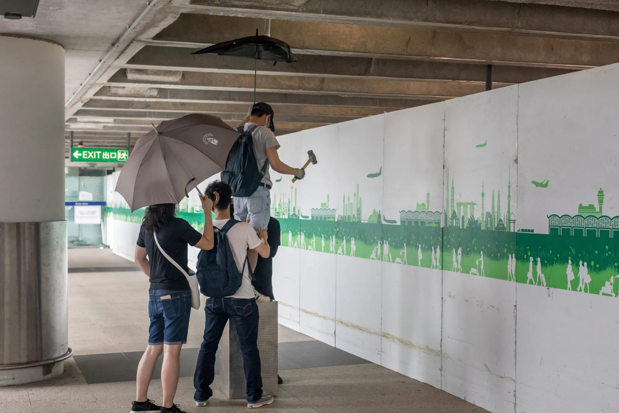 示威者用锤子砸坏香港国际机场外的监控摄像头。摄影师:保罗·杨/彭博社