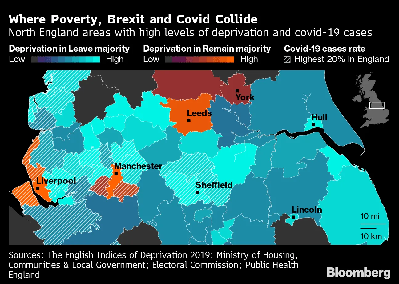 支持脱欧的地区推动了鲍里斯·约翰逊首相在英国掌权,现在正 遭受新冠病毒的不成比例打击*,并将承受经济后果的主要压力。*