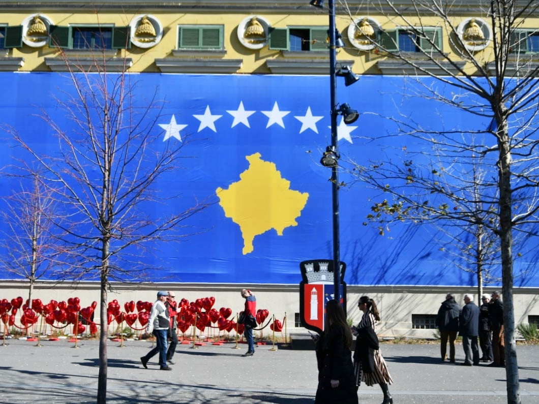 一面巨大的科索沃国旗悬挂在蒂拉纳市政厅,以纪念科索沃于2月17日独立12周年。