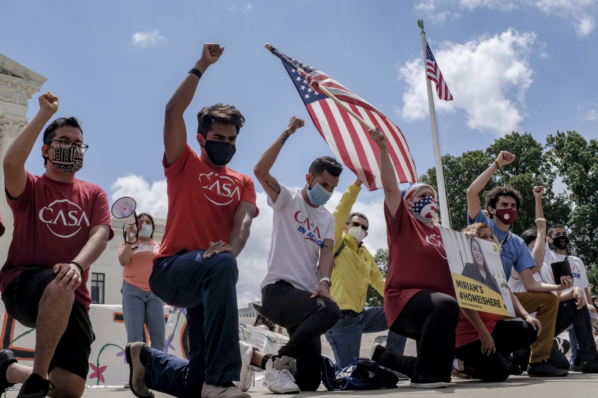 DACA示威者在6月18日跪在华盛顿的美国最高法院外。