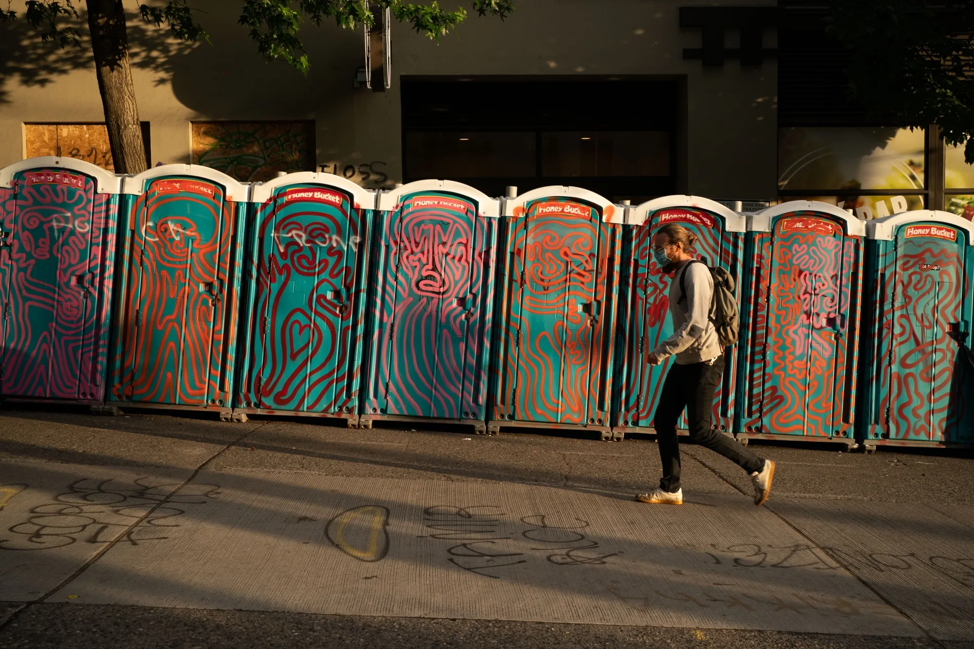 市政府提供了一排可移动厕所。CHOP抗议者提供了装饰。(照片:大卫·赖德/盖蒂图片社)康考迪亚的德拉·利亚塔从2011年和2012年中提出了另一个有教育意义的教训:“你不能对被占领的空间过于依恋,”他说。例如,今天,私人拥有的公共空间祖科蒂公园几乎没有变化,除了由其企业管理者安装的一座雕塑。“但是在接受失去空间的同时,我们也学到了网络、团结、战术——总之,运动——超越空间而存在:它在时间中存活。”