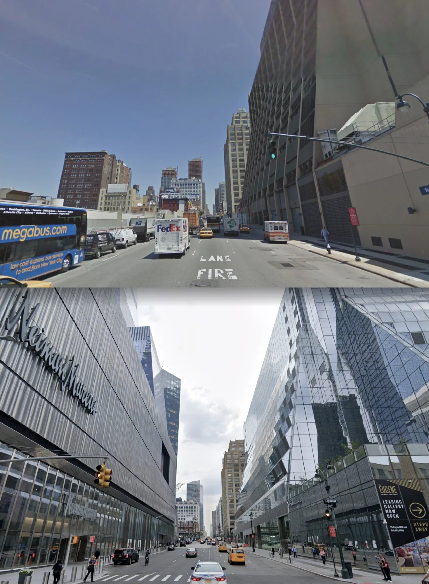 2009年6月的纽约(上)和2019年6月的纽约(下),在哈德逊园区建设之后。来源:谷歌地图 / 街景综合来看,这些趋势塑造了一个深刻而令人困扰的新城市危机——这不仅是城市的危机,也是广义上晚期资本主义的危机。但是,办公和商业房地产需求的萎缩、已经过度建设的奢侈住房市场买家减少,以及城市零售的持续惨败,将使城市房地产变得更加负担得起。毕竟,正如简·雅各布斯常常提醒我们的,廉价空间仍然是城市活力的基本推动力。尽管疫情带来的经济冲击对塑造城市生活复杂人行道芭蕾的餐馆、咖啡馆、精品店、画廊和音乐场所造成了严重打击,但它也将使城市能够重置和充电其创意场景。简而言之,它提供了重建更少分裂和更公平城市空间的机会。