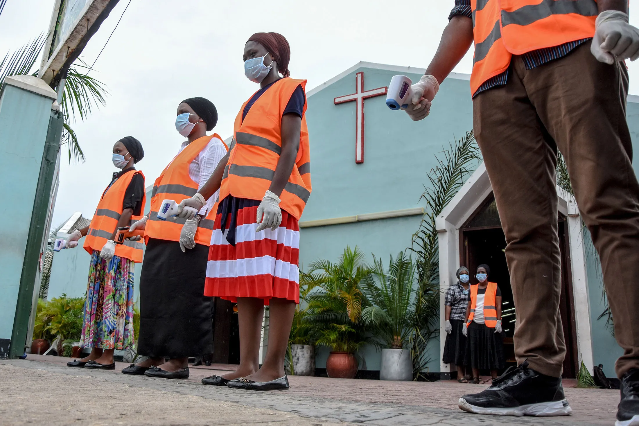 教会成员等待礼拜者扫描他们的体温,在达累斯萨拉姆的棕枝主日弥撒中。摄影师:埃里基·博尼法斯/法新社